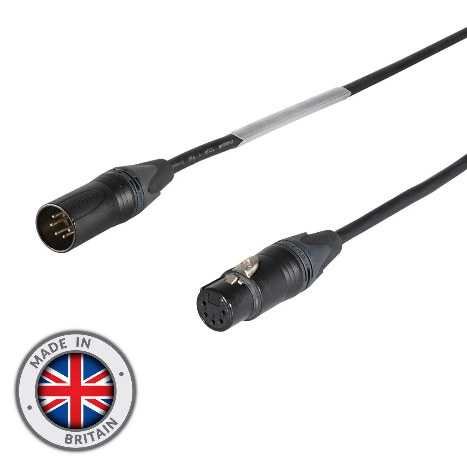 Elumen8 DMX cables are high quality cables made in Britain using genuine Neutrik 5-Pin XLR connectors and Elumen8 tour grade 1 pair screened DMX cable. Designed to carry digital signals from a lighting control console to dimmers or any other device that requires DMX to operate. A super flexible durable and water-resistant PVC jacket protects the inner workings of the cable from harsh environments. In addition the inner liners have heat resistant materials to protect the integrity of the signal even when subjected to high temperatures. Made in Britain Super flexible PVC outer jacket 5-Pin Neutrik male NC5MXX-BAG XLR to 5-Pin female NC5FXX-BAG XLR Black XLR connectors Heat resistant 110Ω impedance cable Tinned copper cores 1 pair plus braided screen and tinned drain wire Aluminium/polyester foil screen Clear heatshrink suitable for identification or asset label Length: 0.5m
