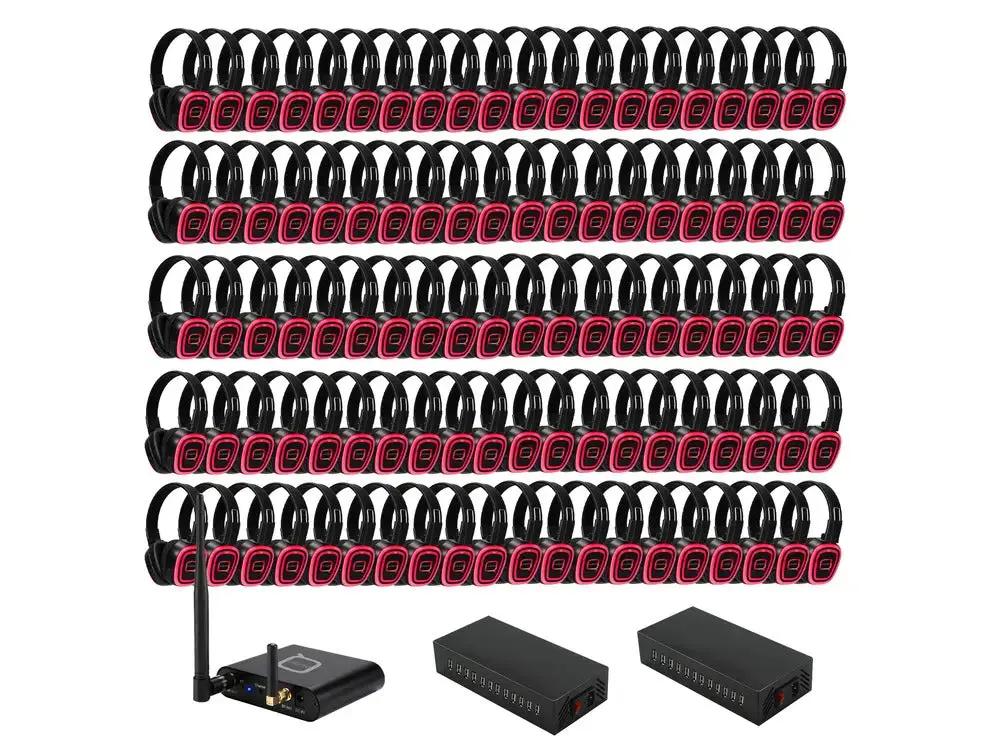 High-Capacity 100-User Bundle: A complete silent-disco package built around one hundred professional QSD-3PRO headset receivers, ideal for large events, corporate functions, or high-capacity venue installations.