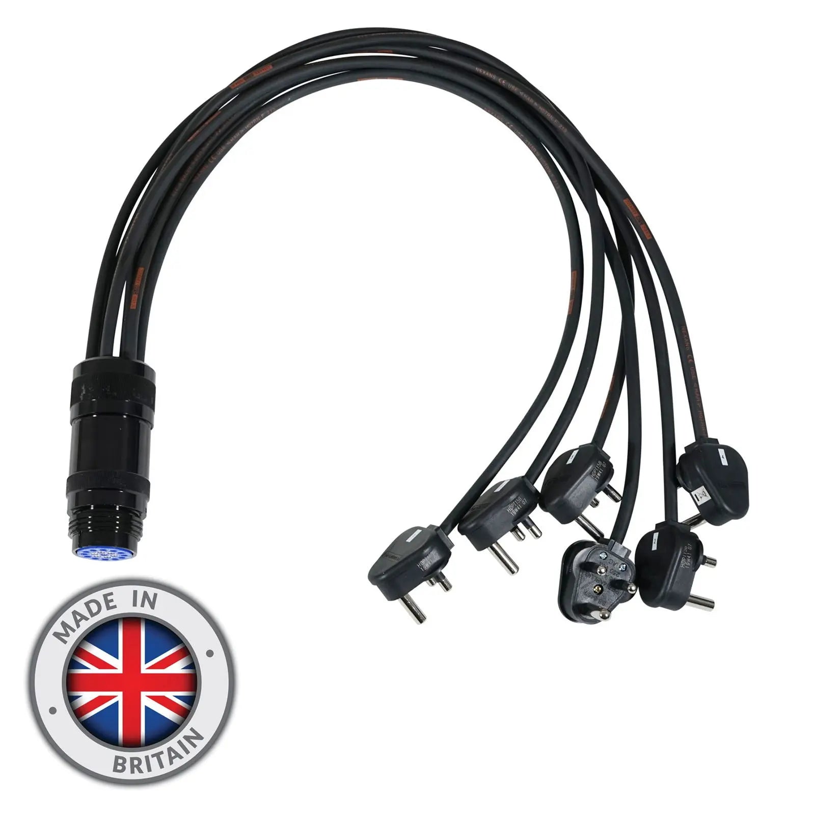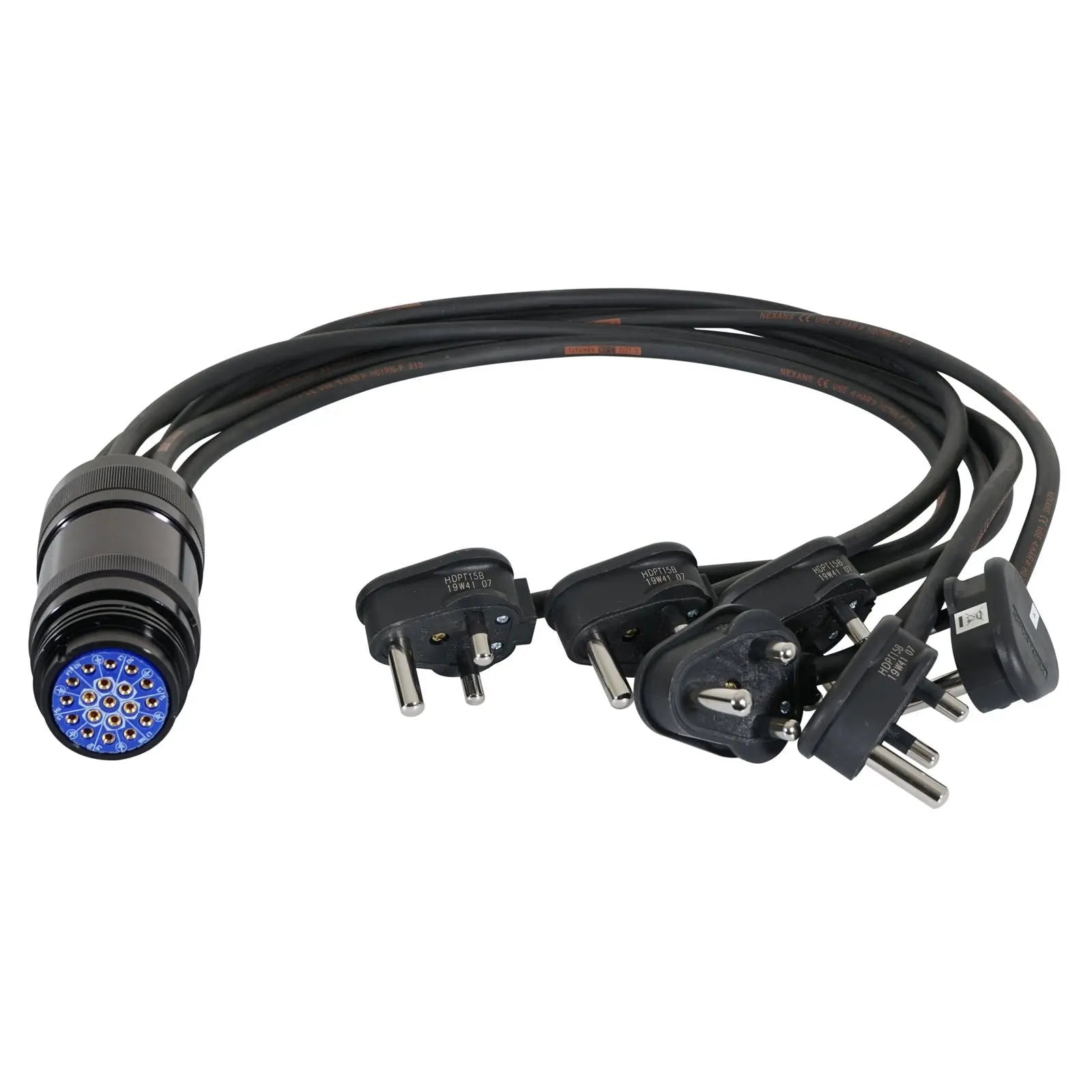 High quality rental-ready Socapex fan in cable made in Britain from Titanex H07-RNF cable and Elumen8 Showsafe 19-Pin UL certified Socapex connectors. The cables are finished with a short length of clear heatshrink ready for identification or asset label and each tail is numbered to aid circuit identification. Made in Britain Titanex H07-RNF 1.5mm cable Elumen8 Showsafe 19-Pin connectors complete with 6-way cable gland 6 x Masterplug 15A round pin connectors Clear heatshrink suitable for identification or asset label Oil resistant and flame retardant according to IEC/EN 60332-1-2 standard Chemical resistant cross-linked elastomer insulation Bare copper conductors Operating temperature range: -25 to 55°C Maximum conductor temperature in service: 90°C Amphenol Socapex SL419 compatible IP67* ingress protection when mated (*Socapex end) FMLB (first make last break) earth contacts Multi-point gold plated contacts Individual tail length: 1m