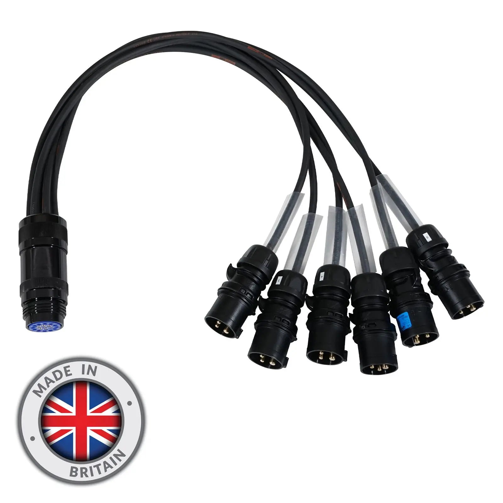 High quality rental-ready Socapex fan out cable made in Britain from Titanex H07-RNF cable and Elumen8 Showsafe 19-Pin UL certified Socapex connectors. The cables are finished with a short length of clear heatshrink ready for identification to be added and each tail is numbered to aid circuit identification. Made in Britain Titanex H07-RNF 1.5mm cable Elumen8 Showsafe 19-Pin connectors complete with 6-way cable gland 6 x 16A 230V 2P+E black plugs Clear heatshrink suitable for identification or asset label Oil resistant and flame retardant according to IEC/EN 60332-1-2 standard Chemical resistant cross-linked elastomer insulation Bare copper conductors Operating temperature range: -25 to 55°C Maximum conductor temperature in service: 90°C Amphenol Socapex SL419 compatible IP67* ingress protection when mated (*Socapex end) FMLB (first make last break) earth contacts Multi-point gold plated contacts Individual tail length: 1m