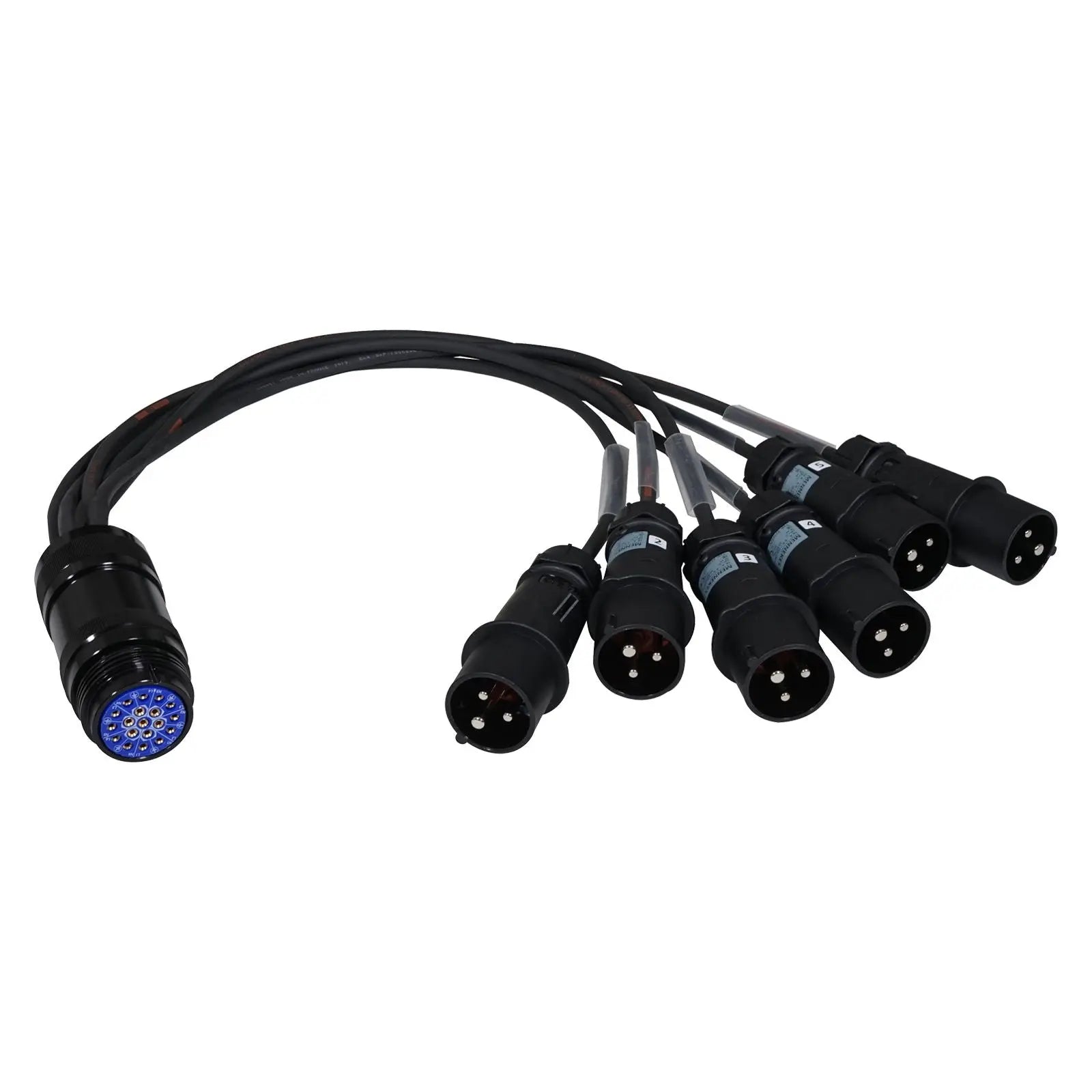 High quality rental-ready Socapex fan-in cable made in Britain from Titanex H07-RNF cable and Elumen8 Showsafe 19-Pin UL certified Socapex connectors. The cables are finished with a short length of clear heatshrink ready for identification or asset label and each tail is numbered to aid circuit identification. Made in Britain Titanex H07-RNF 1.5mm cable Elumen8 Showsafe 19-Pin connectors complete with 6-way cable gland 6 x 16A 230V 2P+E black plugs Clear heatshrink suitable for identification or asset label Oil resistant and flame retardant according to IEC/EN 60332-1-2 standard Chemical resistant cross-linked elastomer insulation Bare copper conductors Operating temperature range: -25 to 55°C Maximum conductor temperature in service: 90°C Amphenol Socapex SL419 compatible IP67* ingress protection when mated (*Socapex end) FMLB (first make last break) earth contacts Multi-point gold plated contacts Individual tail length: 1m