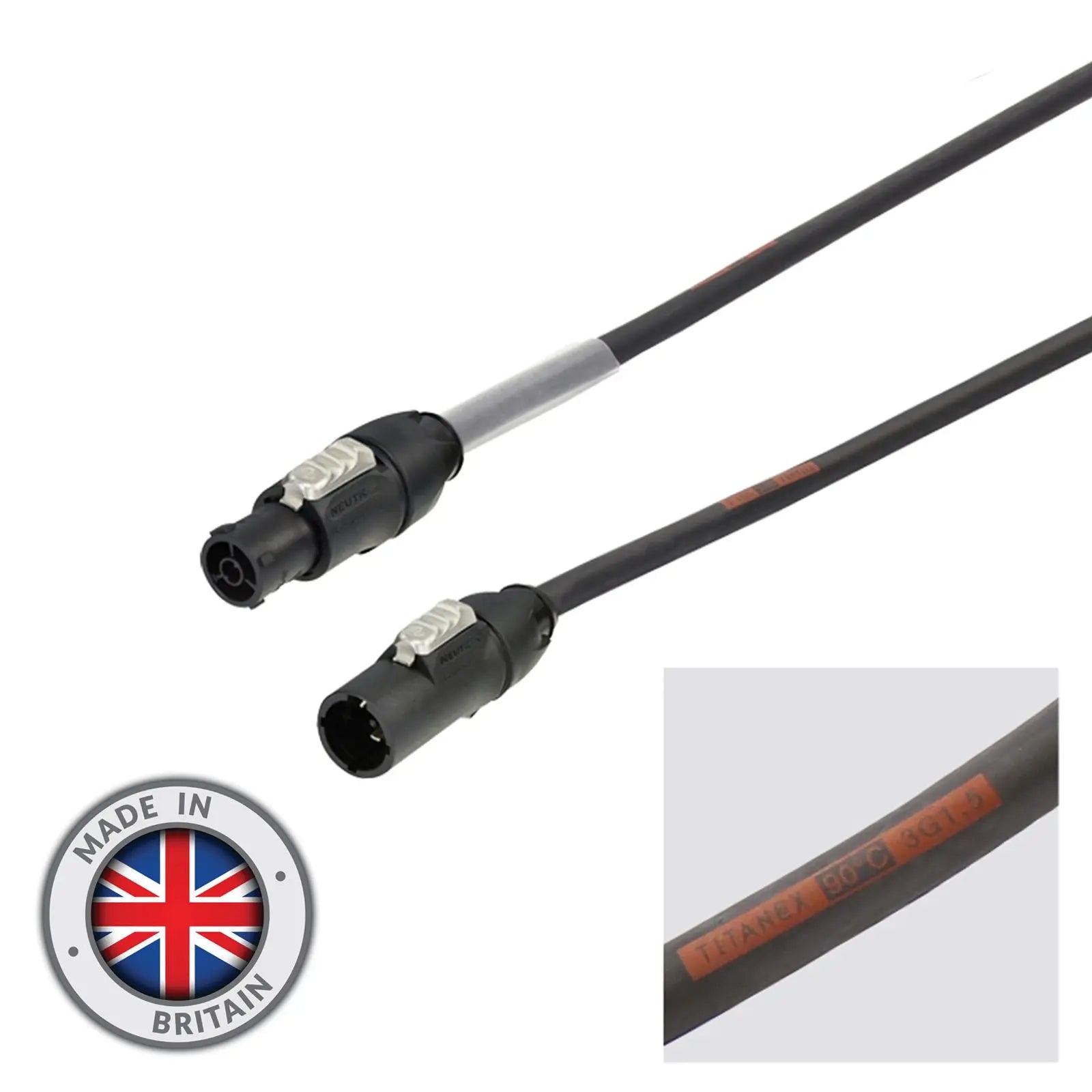Rugged power link cables manufactured using genuine Neutrik powerCON TRUE1 TOP connectors fitted to 1.5mm² Titanex H07RN-F tough rubber sheathed cable. The powerCON TRUE1 TOP is a locking 16A true mains connector for indoor or outdoor applications. The cable is also fitted with a short length of clear heatshrink ready to accept an identification or asset label. Made in Britain IP rating: IP65 Neutrik powerCON TRUE1 TOP connectors H07RN-F 1.5mm² tough rubber sheathed cable Clear heatshrink suitable for identification or asset label 16A current rating Length: 20m