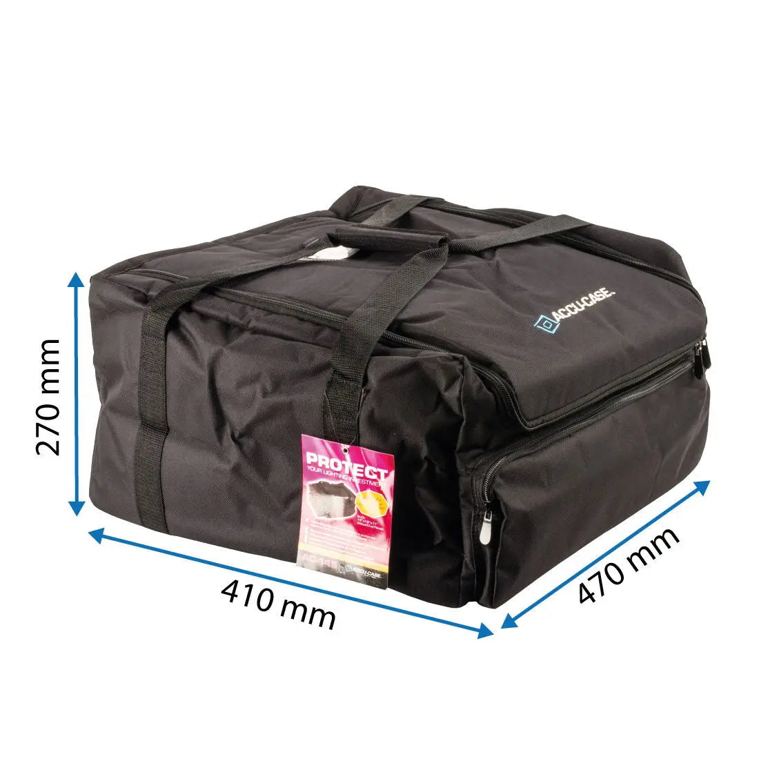 The Accu-case ASC-AC-145 is a soft padded transport bag for Aggressor/Double Derby style fixtures. It offers you a convenient transport possibility for your equipment without wasting space in your car. The bag is made from durable synthetics which makes it dirt-repellent and lightweight. In the additional side bag you can store cables and adapters as well.