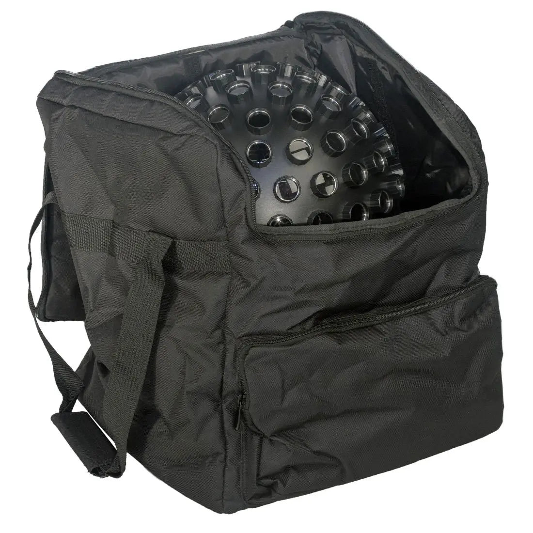 Durable padded gig bag for transporting lighting cables clamps etc. Fits centrepiece style fixtures or similar Front pocket for cables clamps or controllers Black fabric finish Lightweight foldable design for easy storage