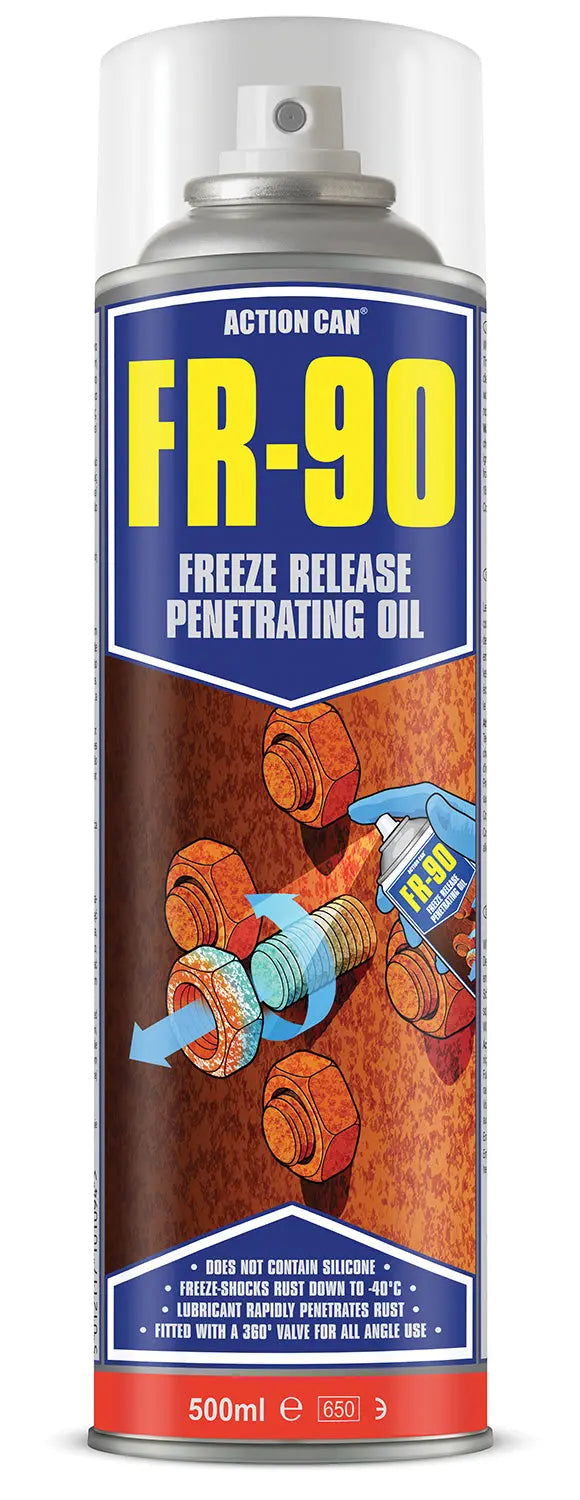 FR-90 is an advanced penetrating oil that shocks rust down to -40˚C, creating micro-cracks, allowing the lubricants to penetrate faster for rapid fastener removal. The silicone free formula is safe for use on all metals surfaces without staining and most plastic, paint and rubber coatings