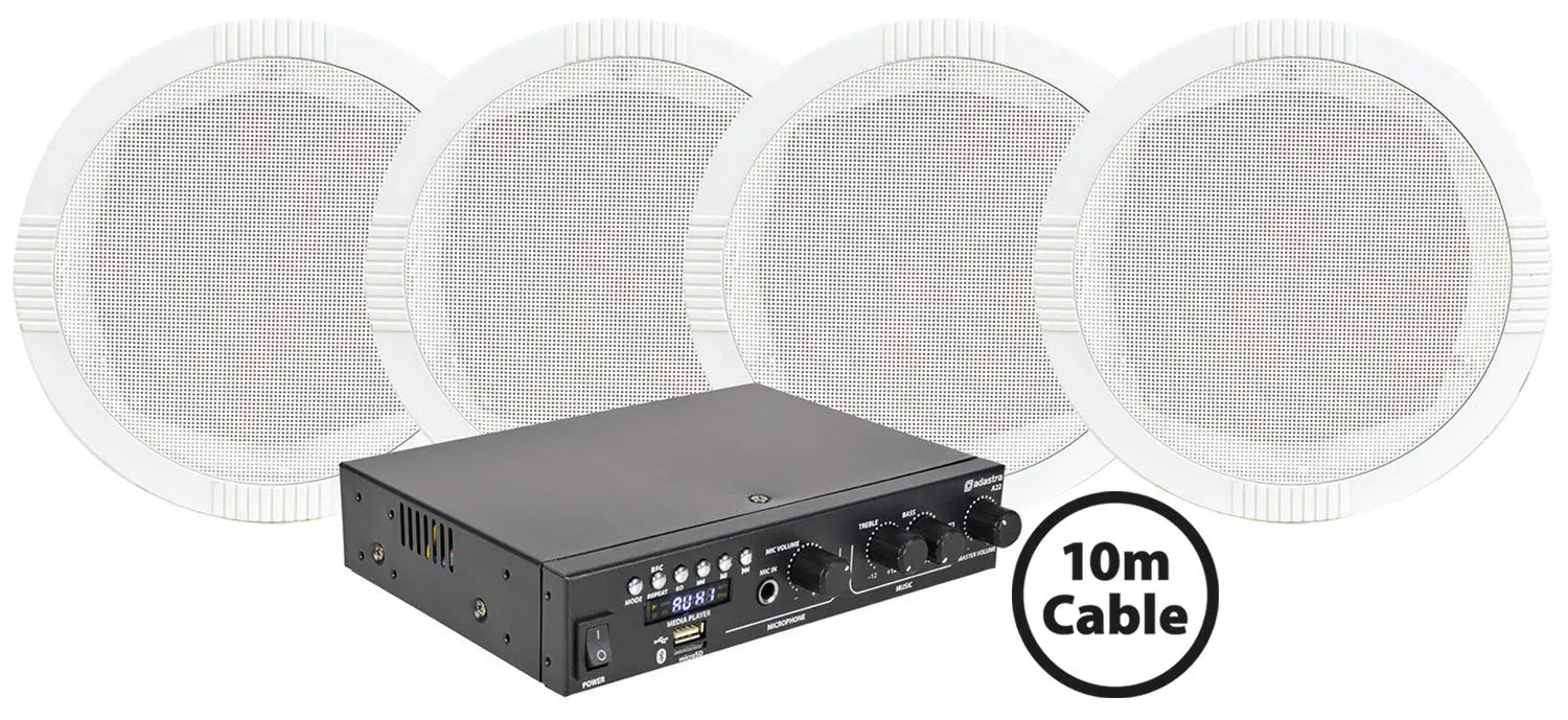 Background music system package comprising a compact A22 amplifier with matching RC5 ceiling speakers. The A22 amplifier is supplied with brackets to enable fixing under a counter top or vertically against a wall for convenience and has an internal Bluetooth receiver, USB/microSD player and FM tuner. A microphone 6.3mm input has its own level control and there are 3 Aux inputs on 3.5mm or RCA sockets for mp3 players, computers or other playback devices. RC5 ceiling speakers are easy to install into false ceilings secured by 3 dog-ear clamps. 10m of speaker cable is included and can be optionally extended to longer runs if required.