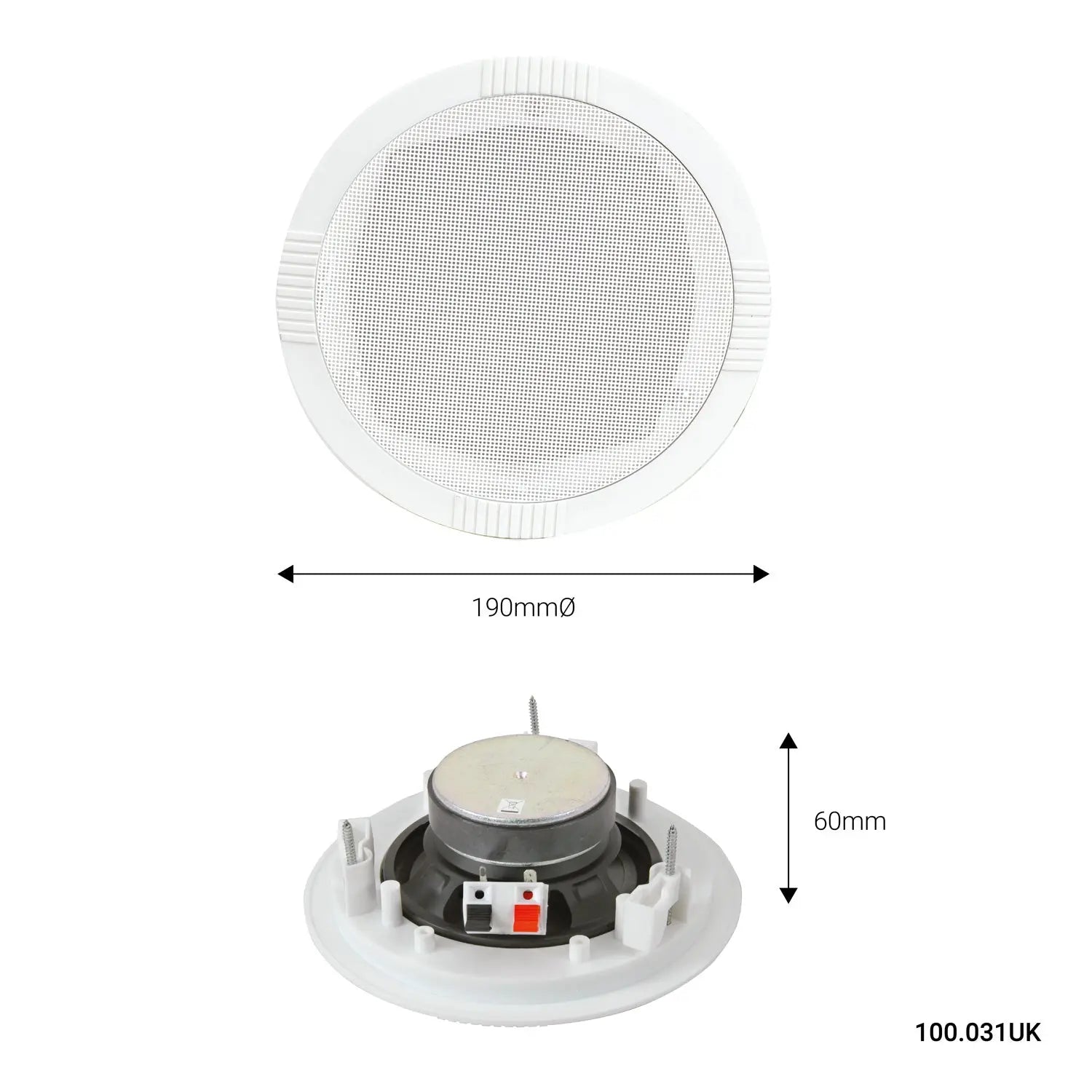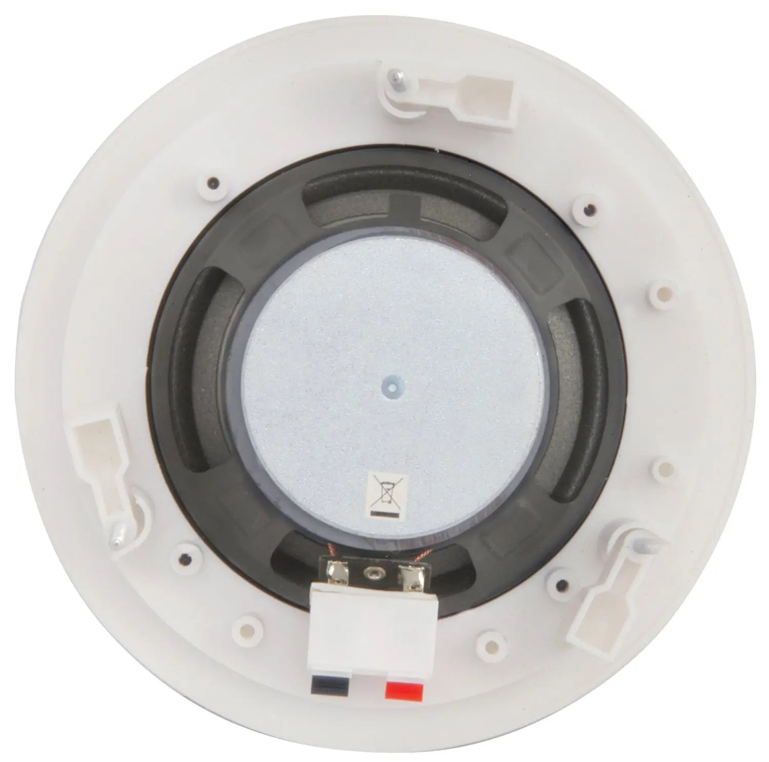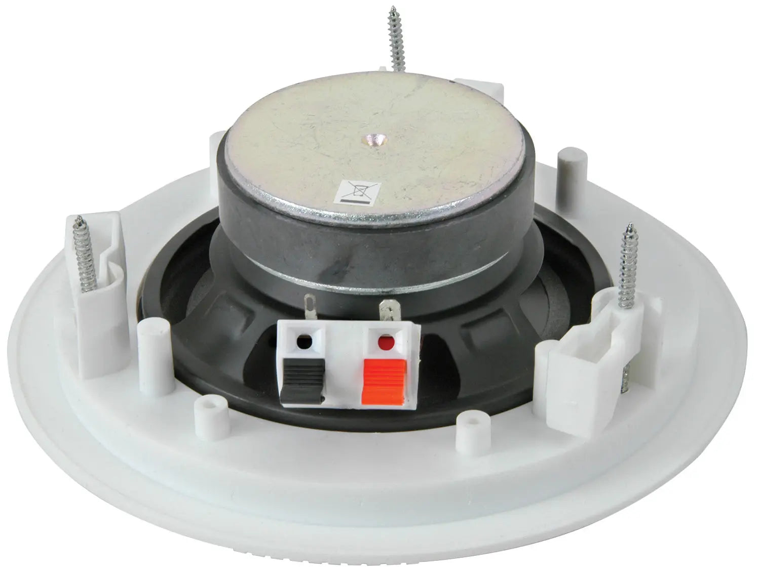 A wide range speaker with a 13cm (5.25") polypropylene cone foam rubber surround to minimise distortion. The housing is made from white ABS with a rigid steel grille also in white to mount discreetly into a ceiling.