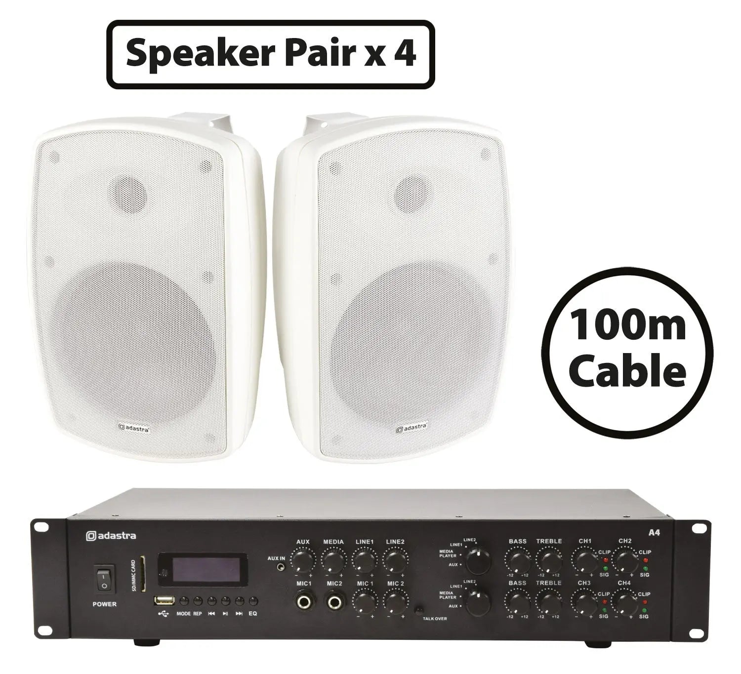 High quality wall speaker packages for premium quality background music in leisure venues such as cafés, bars, bistros and restaurants. BH6 speakers feature computer-designed enclosures with long-excursion 6.5" main drivers for punchy bass and mids and custom dome tweeters for clear HF projection. Each BH6 speaker is supplied with a lateral and tilt adjustable bracket and has a PP cone and coated aluminium grille for operation in sheltered outdoor areas. A-series 2U rack amplifiers are available with 1 to 4 stereo output zones and each has 2 mic inputs for announcements, a USB/SD player, FM tuner and Bluetooth receiver. In each package, every speaker will receive up to 100W of class-D power, delivering 90dB sound power. For louder venues, adding an active sub is recommended. For smaller rooms, 2 speakers may be sufficient per zone. For larger, livelier rooms or for better coverage, 4 speakers per zone is recommended (e.g. 1 in each corner)
