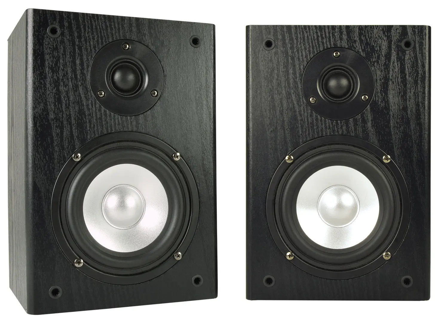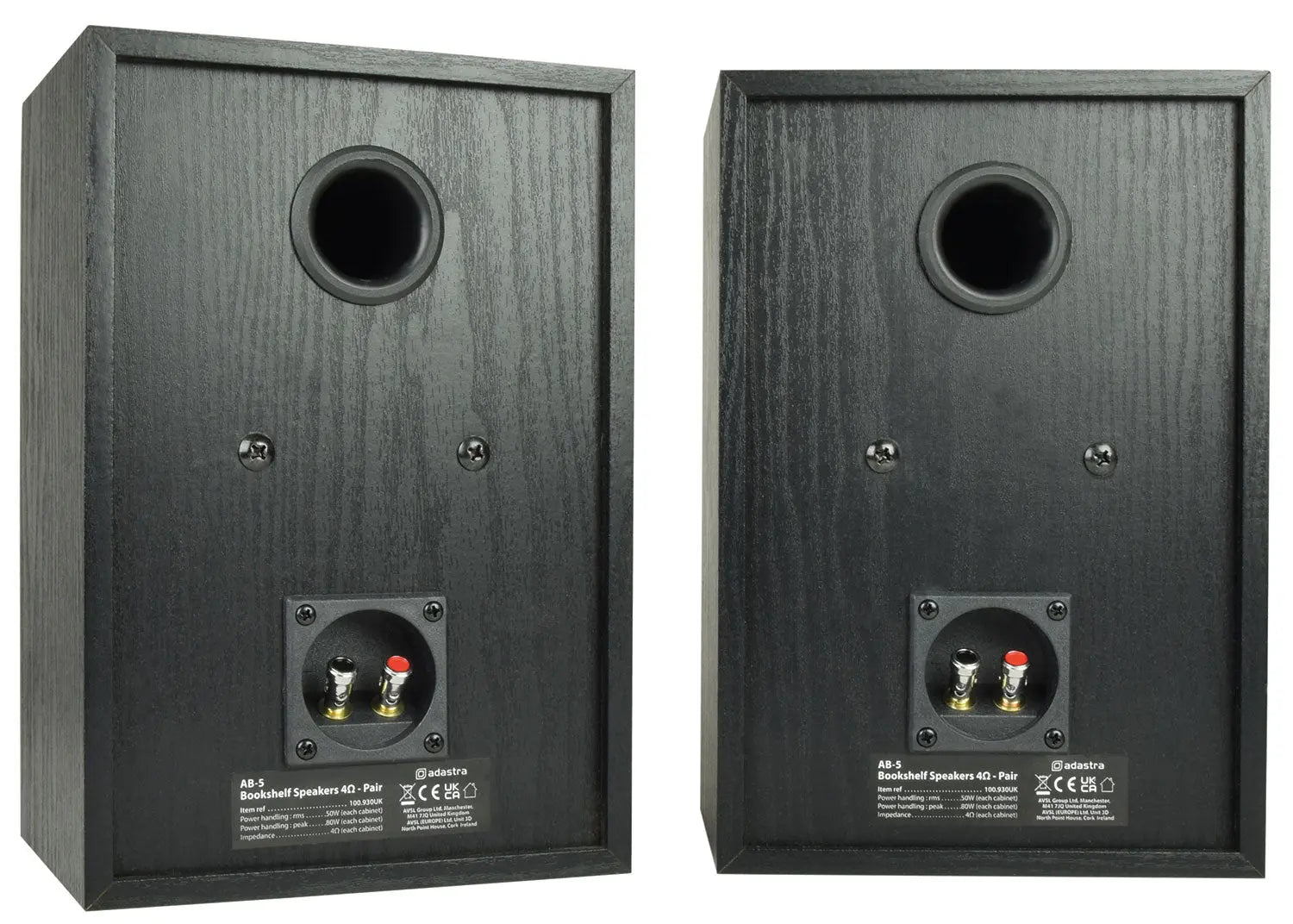 A pair of passive low impedance bookshelf speaker cabinets finished in black woodgrain vinyl with M6 mounting points at the rear. Each speaker provides maximum power conversion with most stereo amplifiers which can operate down to 4 Ohms, and is fitted with a 5.25" main driver and a 1" silk dome tweeter for balanced, full range output. A perfect match for Adastra and other low impedance amplifiers for background music, radio and voice announcements.
