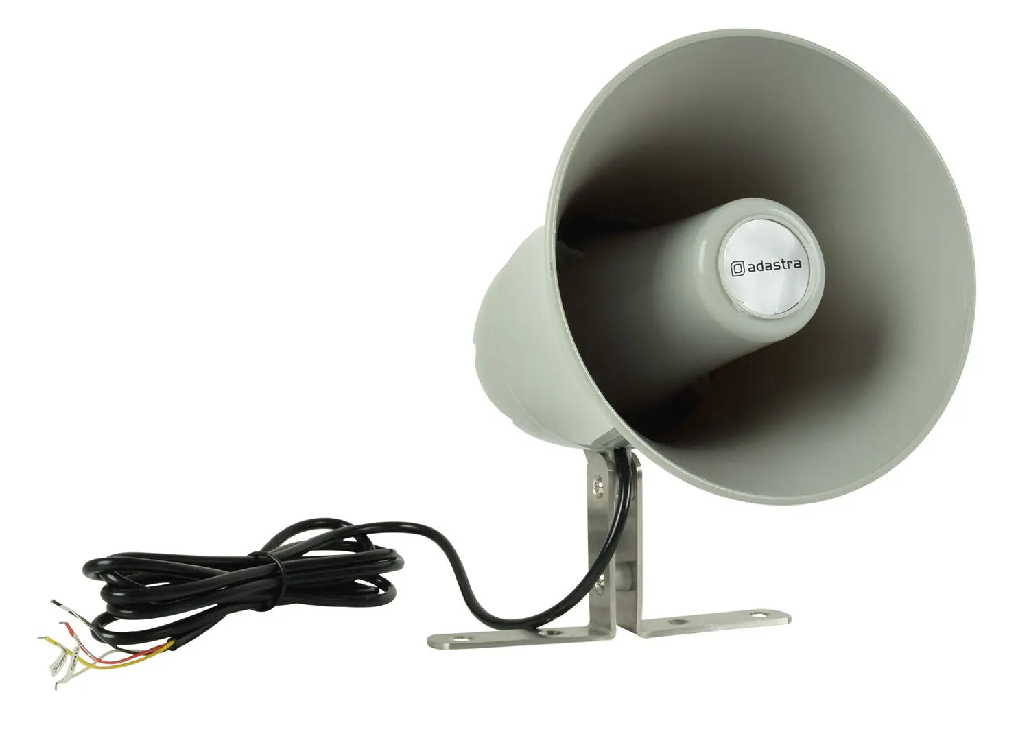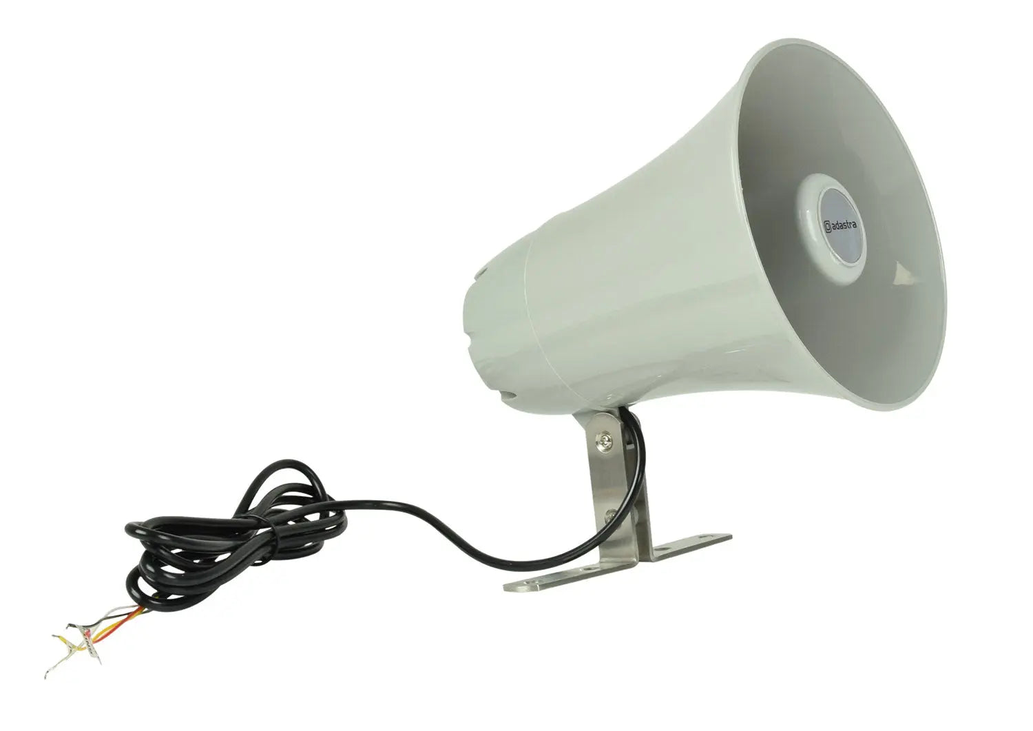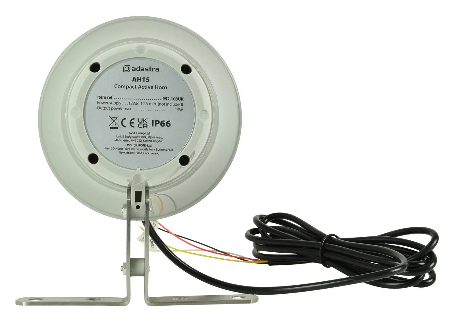 Compact format active horn speaker with built-in amplifier for indoor or outdoor use. Constructed from high impact ABS material with IP66 protection for reliable operation in all environments. Fitted with an angle-adjustable bracket for convenient installation onto a wall or ceiling. Low voltage power and line level audio are connected via a single 4-core cable for simplified cable feed and connection. Designed for voice alerts in CCTV and security systems or as a self-contained add-on for existing public address installations.