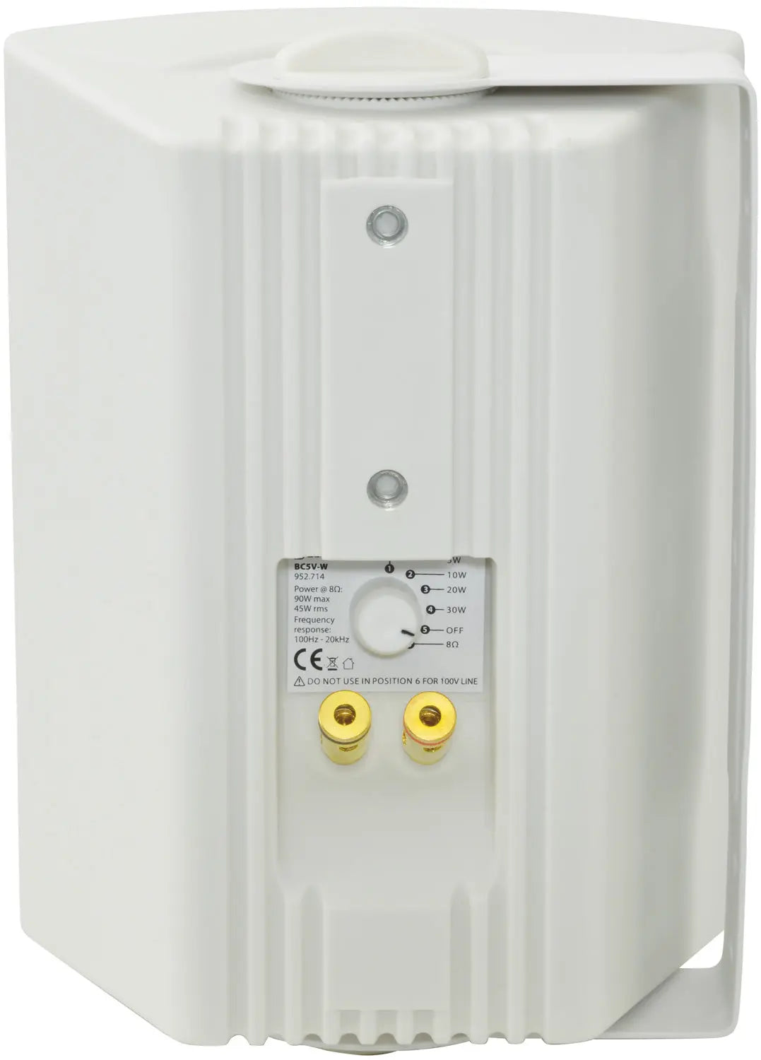 Industry standard 100V indoor speakers with ABS enclosures and a powder coated steel grille grille. Wall or ceiling surface mounting via the adjustable steel bracket. The trapezoidal design allows for the enclosures to be mounted neatly into corners or angled for directional coverage. Main drivers have high quality coated paper cones for full-sounding low and mid-range frequencies, ideal for music playback and clear voice announcements.