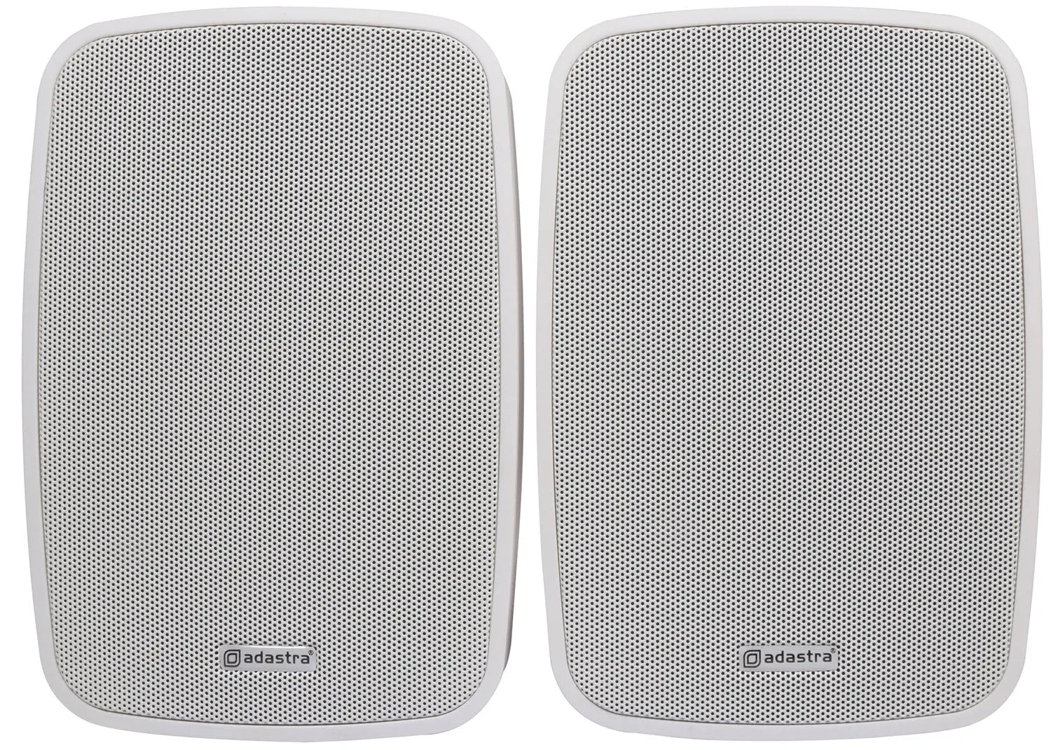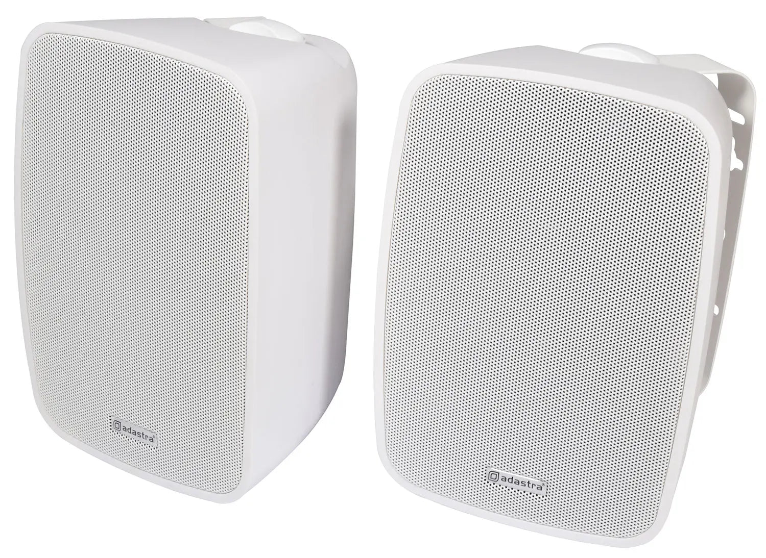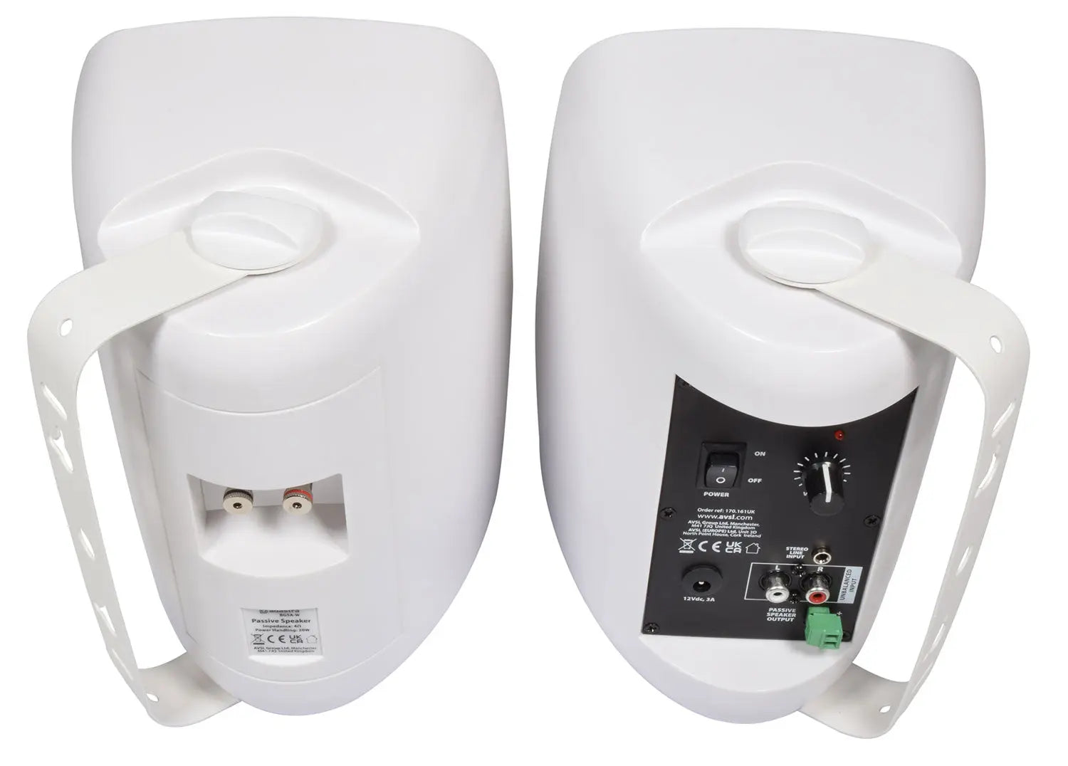 Active stereo indoor background speaker set, comprising an active main unit and satellite speaker with connecting lead. Both main and satellite units have a moulded ABS cabinet with powder-coated steel grille and deliver up to 20W via a 5 inch full-range driver with smooth frequency response. Supplied with wall mounting brackets and hex screws with magnetic covers for neat installation or regular screw caps for quicker installation and angle adjustment. Low voltage operation with in-line mains power adaptor for safe and easy installation. A cost-effective and stylish solution for background music and smaller PA applications.
