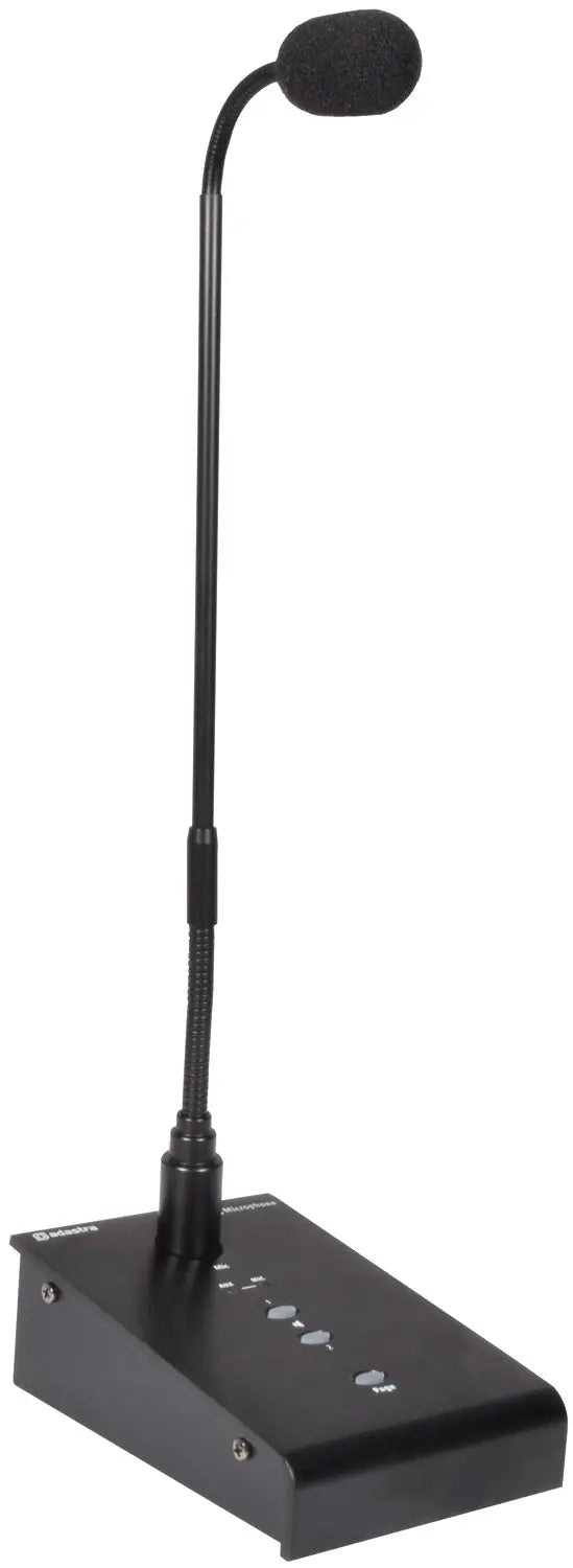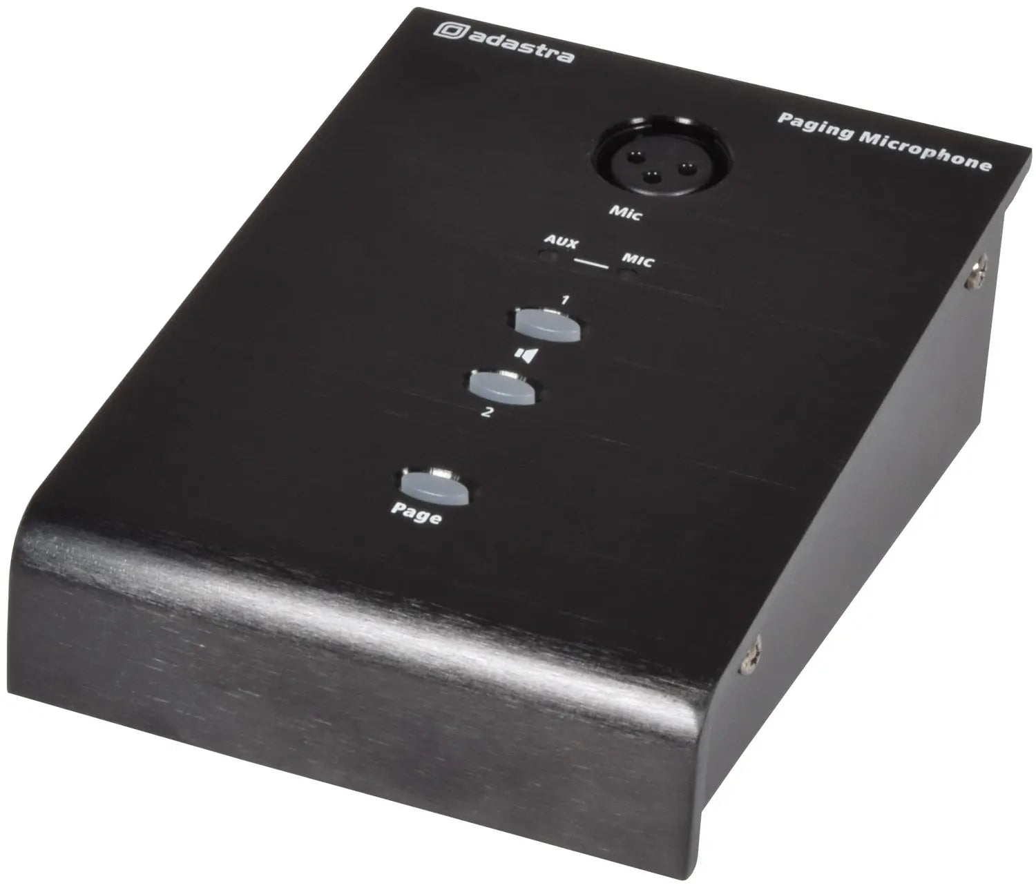 Desktop paging station with gooseneck microphone mounted via XLR into a base unit with a built-in dual amplifier. Each amplifier output has screw terminal speaker connections and can power a single 8 Ohm speaker or two 8 Ohm speakers wired in parallel (4 Ohm minimum load each output) and can be operated as a stereo Left + Right amplifier or as 2 separate zones. An AUX input on 3.5mm jack can accept a stereo line input for background music with its own volume control and is present on both channels permanently. A separate volume control governs the microphone level and there is a pre-set override that temporarily mutes the AUX input when announcements are being made. The paging process involves selecting one or both output channels via the buttons on the top panel and then pressing the "Page" button, which gives the option of paging just a single area or all areas where the speakers are installed. A simple and easy-to-use solution for where space is limited or an uncomplicated paging system is required.