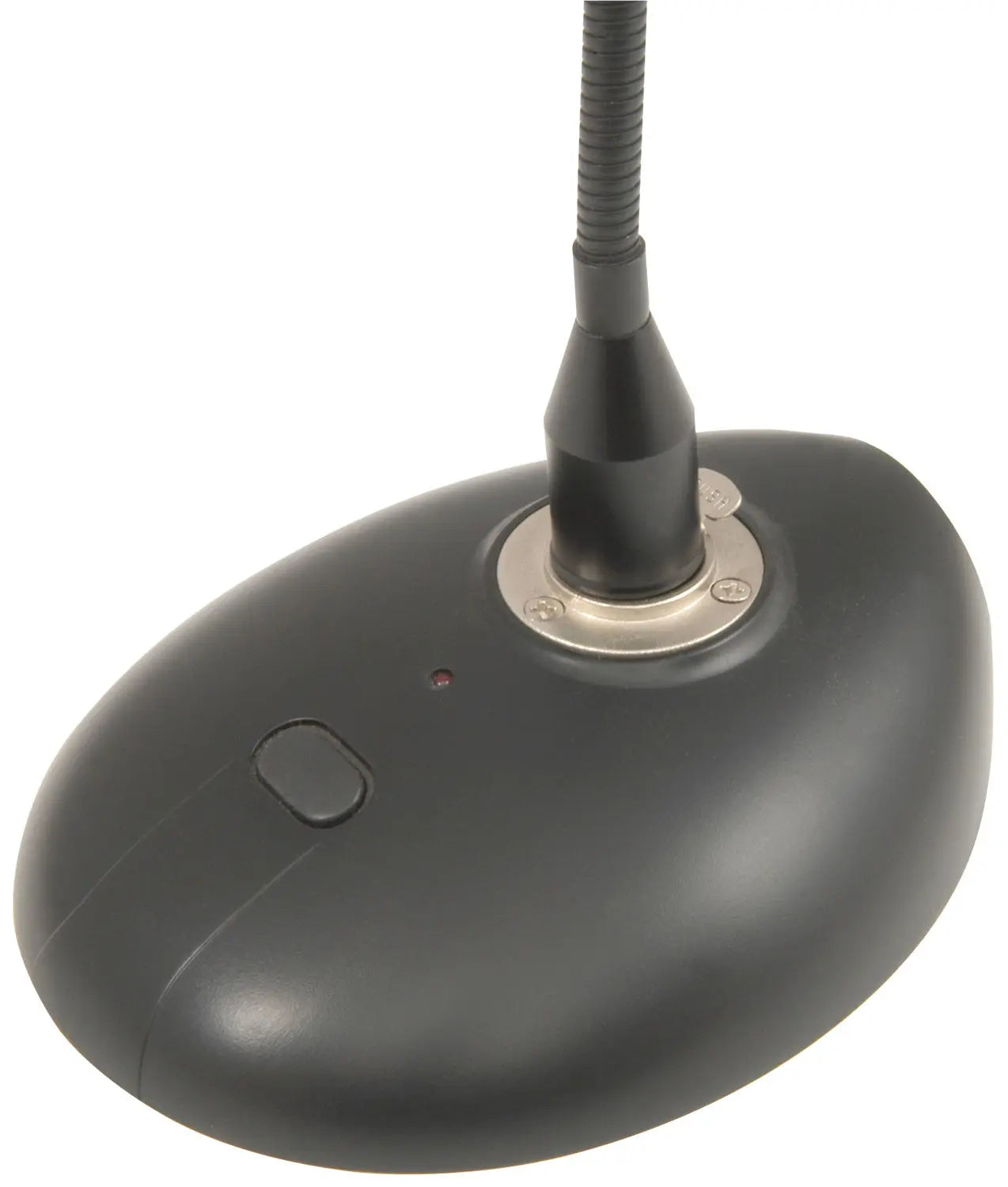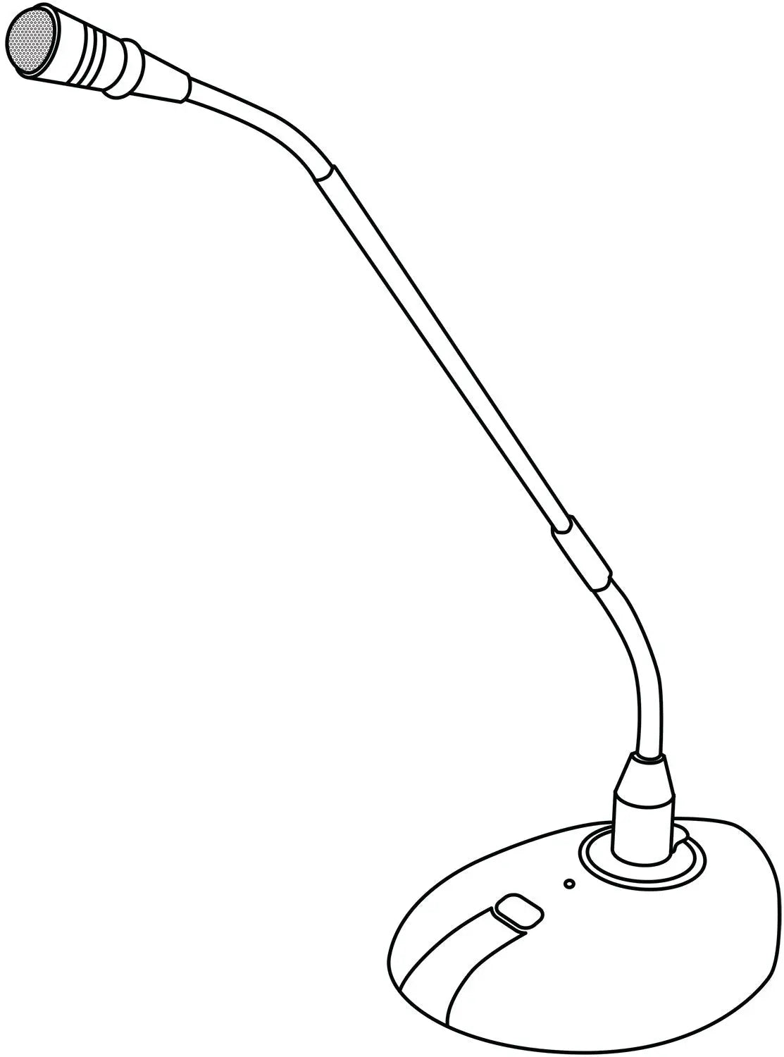 A gooseneck microphone with base for conference or paging applications. Connection to the base is via XLR and provides power to the condenser microphone capsule either from 2 x AAA batteries in the base or from external phantom power.