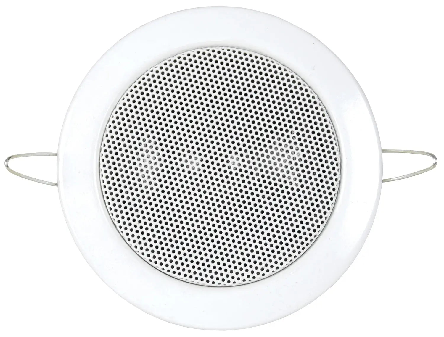 Miniature ceiling speaker with metal frame and spring retainers for flush-mounting into ceilings or walls. Fitted with a 100V transformer with tappings for 3W or 6W output and a 3" paper cone which is treated with a water-resistant coating to enable installation in wet areas, such as washrooms or food preparation areas.