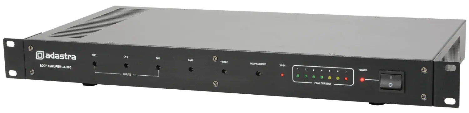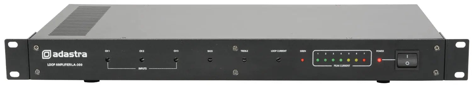An induction amplifier for driving a cable loop around a room to provide assisted listening for hearing aid users. Front panel controls are adjusted using a screwdriver including level controls for the 3 mic/line channels, bass, treble and loop current. Designed to provide hearing assistance in public and commercial buildings.
