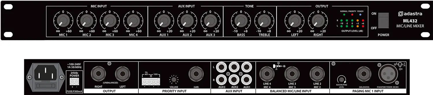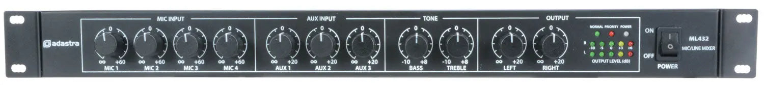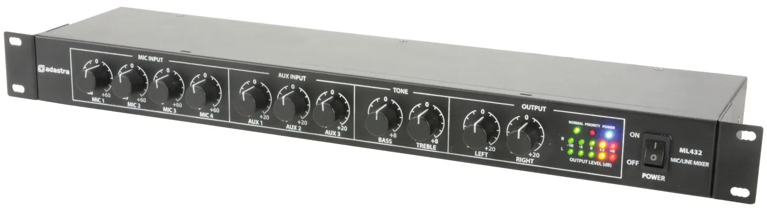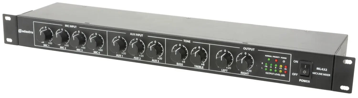 Rack-mountable 1U mixer with 4 mic inputs and 3 auxiliary inputs. Mic channel 1 has 20V phantom power and adjustable voice-over muting of auxiliary channels. An additional priority input can be connected to a line level input or an external 100V line PA system for emergency paging. Output connections are stereo jack with master bass and treble tone controls. Designed as a master or extension mixer for installed sound systems.