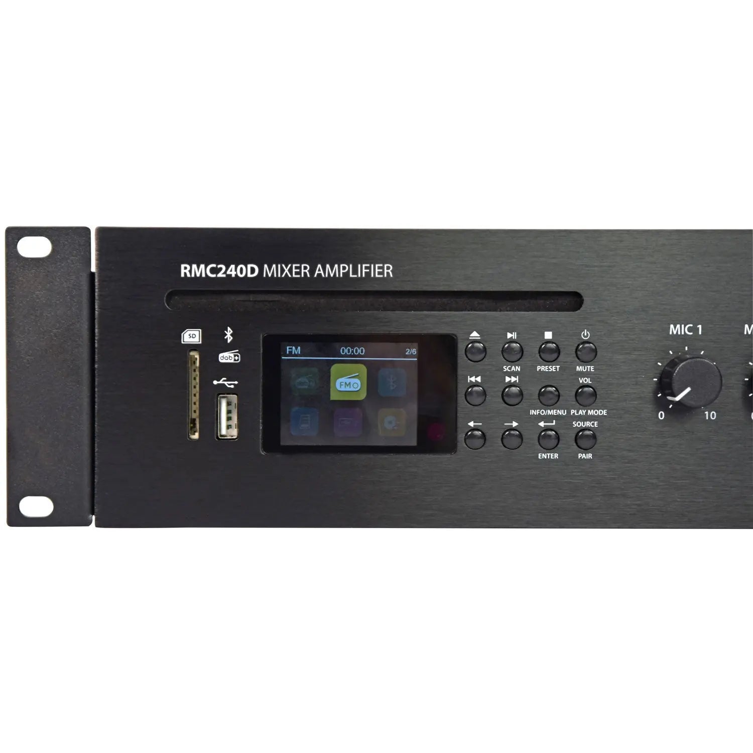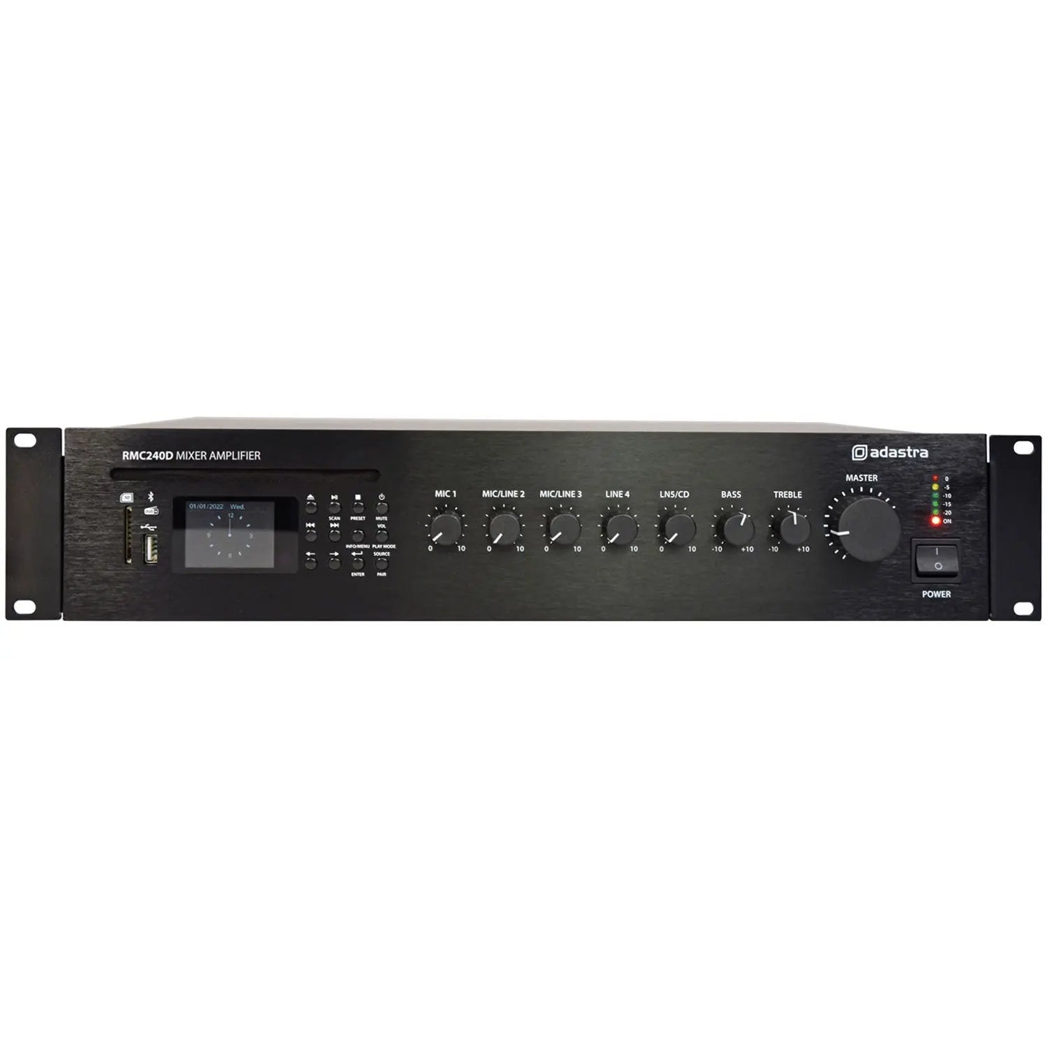100V line mixer-amplifiers with built-in multi-format media player. 5 input channels include a balanced XLR microphone input with switchable phantom power and Vox override, 2 mic/line jack inputs and 2 RCA line inputs. A powerful class AB amplifier section is paired with a digital switch-mode power supply and 100V transformer for reliable power delivery from an energy efficient power section. A built-in CD player provides audio playback alongside a USB/SD media player with an integral DAB+ and FM radio tuner. A Bluetooth® receiver enables pairing to a smartphone for wireless playback of stored tracks. Bass & Treble EQ and Master volume control the overall output, which can power either low impedance or 100V line speakers. A comprehensive solution for commercial sound installations.