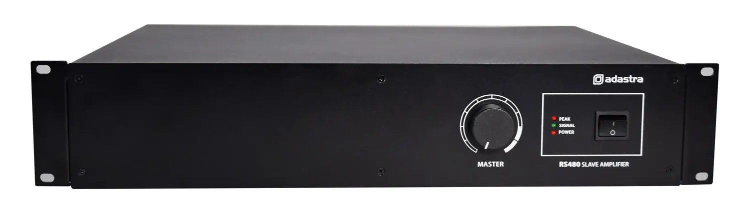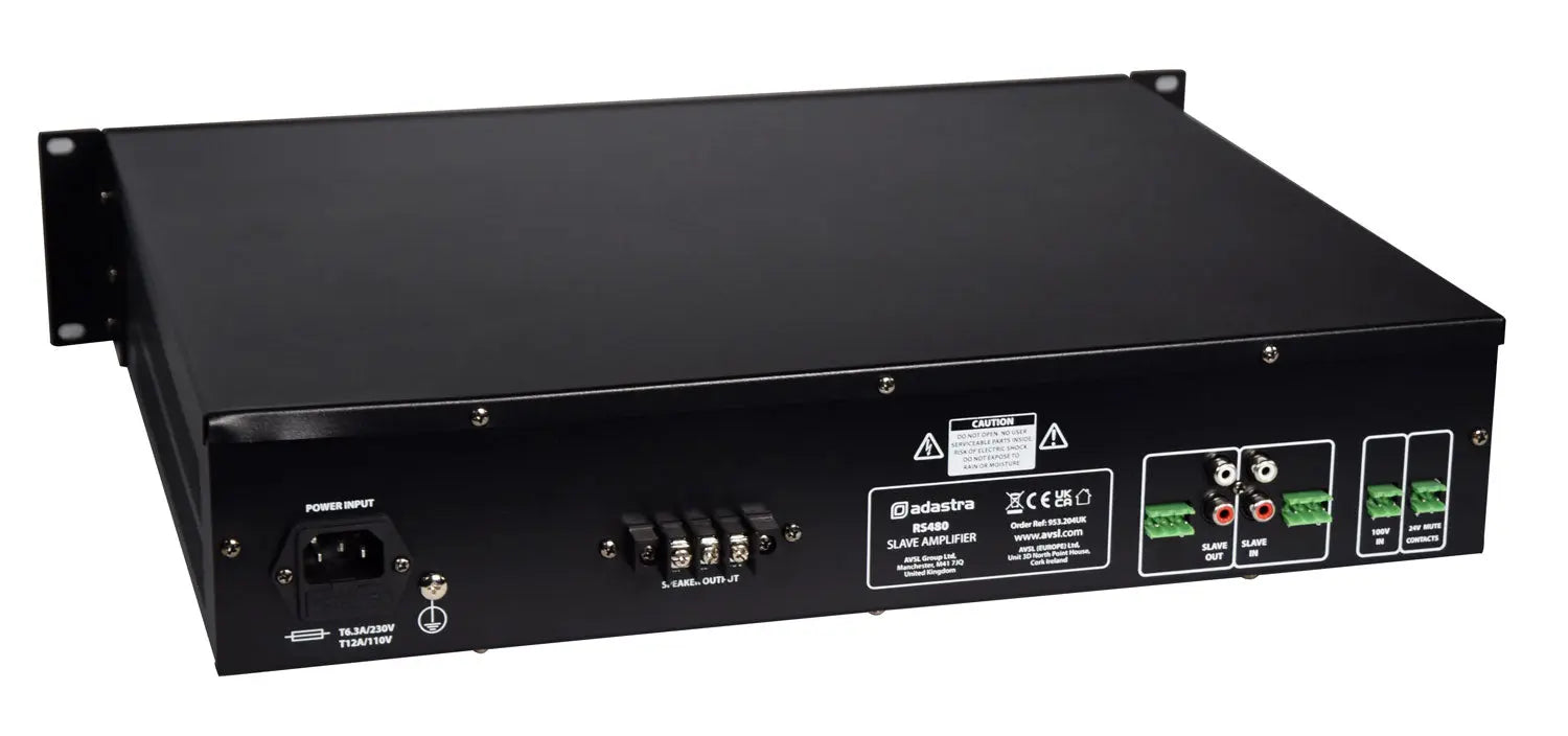 High power class-D 100V line slave amplifiers in a rack-mountable housing. Slave inputs accept standard line level audio from a mixer or RM series mixer amplifier. Slave outputs can be cascaded onto further RS slaves to build larger systems. All line level inputs are connectable via RCA sockets or hard-wired via removable screw terminals. A further removable screw terminal is provided for 100V input, which enables the RS series slave amplifier to extend an existing 100V installation by connecting directly to the 100V speaker feed, or indeed from a long distance 100V feed using standard double-insulated cable. A 24V terminal is provided for connection to a security or alert panel to mute the output if required during alarm triggering. Speaker outputs are either 100V or low impedance (switchable on RS121 and RS241) which is stable down to 2 Ohms, enabling multiple low impedance speakers to be connected if preferred. Designed to power medium to large installations from a mixer output or to expand existing systems.