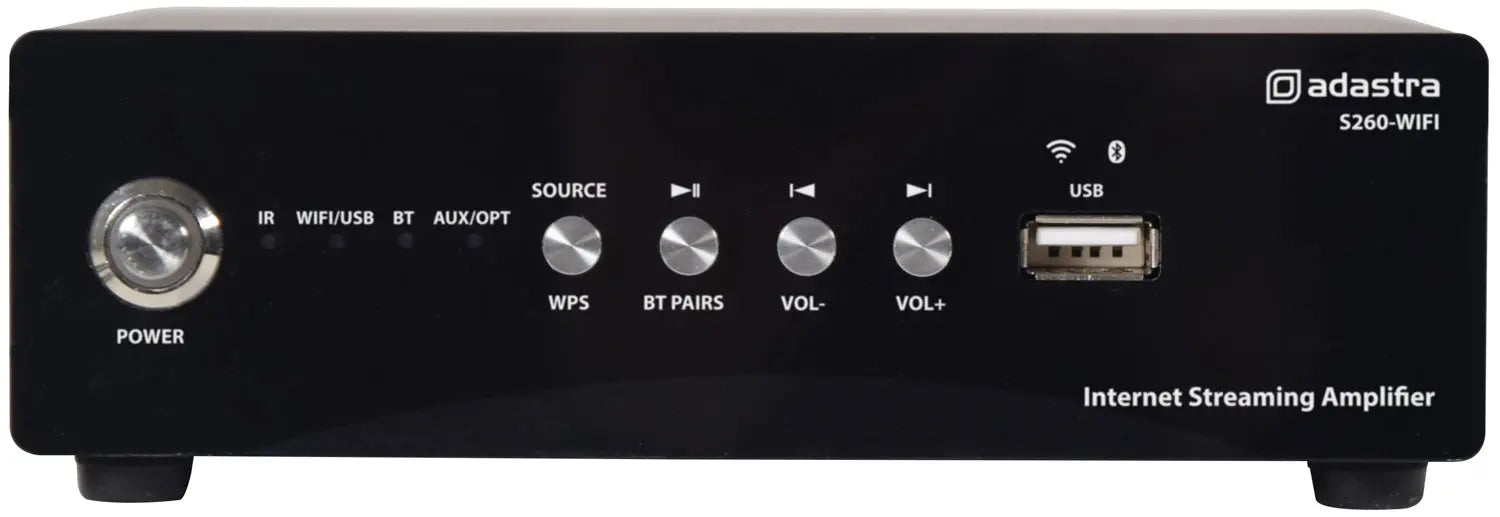 Class-D miniature amplifier delivering up to 2 x 60W output with Bluetooth and WiFi streaming capability. Controlled from an Android or iOS smart phone, the S260-WIFI is compatible with freely available apps to stream music and podcasts directly from a WiFi network. Embedded internet radio offers high quality digital audio from almost any online radio station or podcast available worldwide. Subscription services can store online playlists which can be cast directly from the internet without requiring the smart phone to be connected to the network. Wireless streaming of tracks and playlists stored on the smart phone can be sent from within the app or directly via Bluetooth to the amplifier. A line input is selectable for connection to a TV, CD, DVD or other playback device if required. In addition, the S260-WIFI has inputs for USB for playback of stored tracks. This neat unit provides a versatile "hands off" background music solution for continuous playback of music from internet services or a choice of other sources for bars, cafes, restaurants, reception areas and house parties.