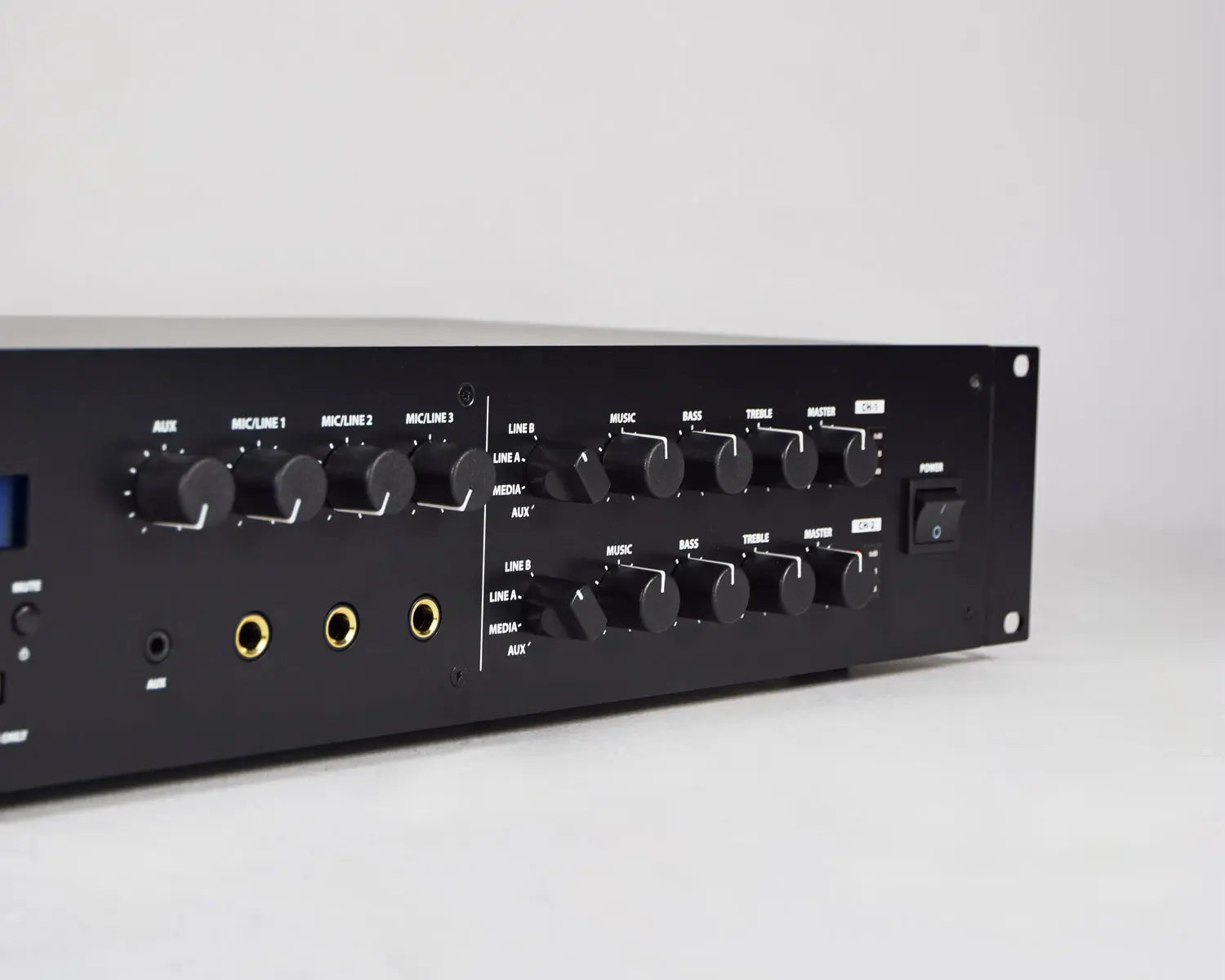 Fully-featured mixer-amplifier with class-D amplifier section, delivering 100V or low impedance output to 2 independant public address zones. Featuring a built-in audio player with Bluetooth® and DAB+/FM receiver, along with a USB/SD mp3 player for flexible and convenient playback of music or spoken information. Inputs include 3 balanced mic/line channels, which are live to both zones at all times, with switchable phantom power and selectable priority for channel 1. Additionally, a rotary selector for each zone can switch between 2 unbalanced line inputs, an auxiliary line input or the internal audio player section. Speaker connections are provided on screw terminal blocks with options for 100V line or 4-8 Ohm low impedance loads. Each zone also has an unbalanced line output if further amplifiers are to be connected to expand the system. Multiple input connections and convenient playback options make this amplifier a complete problem-solver for installers and venue owners, providing flexible and dependable control for distributed audio in commercial and leisure environments.