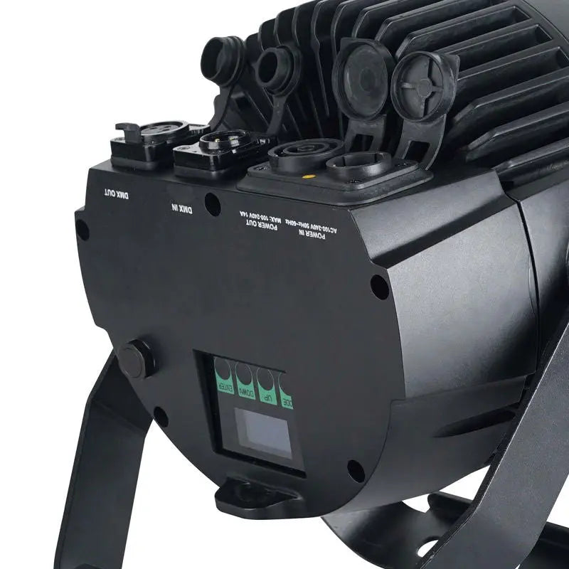 12P HEX IP professional features include: 6 DMX modes 5 operational modes 5 dimming curves flicker free operation and a 4-Button DMX menu with digital display. The unit is equipped with IP65 Locking Power and IP rated 3-pin DMX rubber covers and connectors.