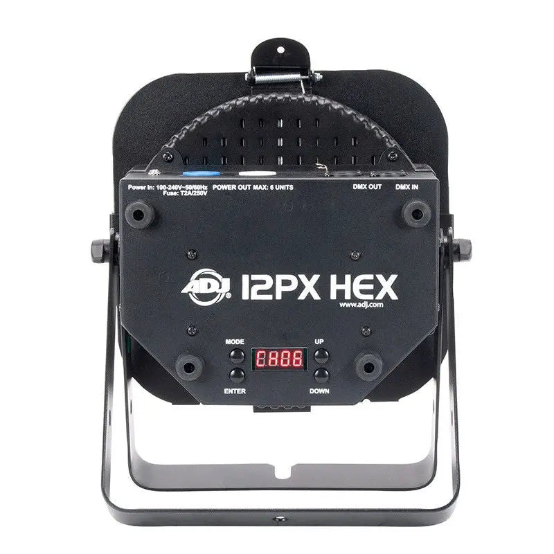 12PX HEX professional features include: 4 DMX modes (6 7 8 & 12 channel) 5 operational modes 5 dimming curves flicker free operation and a 4-Button DMX menu with digital display. Users may choice 3-pin or 5-pin DMX connectors