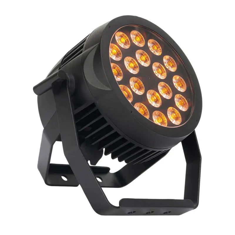 The ADJ 18P Hex IP is a versatile IP65 outdoor rated Par with 18 x 12-Watt (6-IN-1 HEX) LEDs. With a 25-degree beam angle users may produce wide washes with smooth colour mixing from 63 built-in colour macros utilizing red green blue amber white and UV LEDs. Not only is this LED Par great for lighting indoor stages and venues but with IP 65 rating it is a great solution for temporary outdoor lighting of stages or events. The IP 65 rating helps protect the fixture from rain snow and dust.