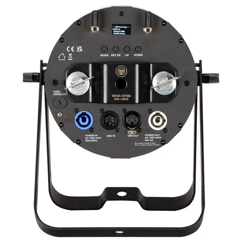 5-pin XLR connectors for DMX data linking Indoor locking power In & Out connections to daisy chain power