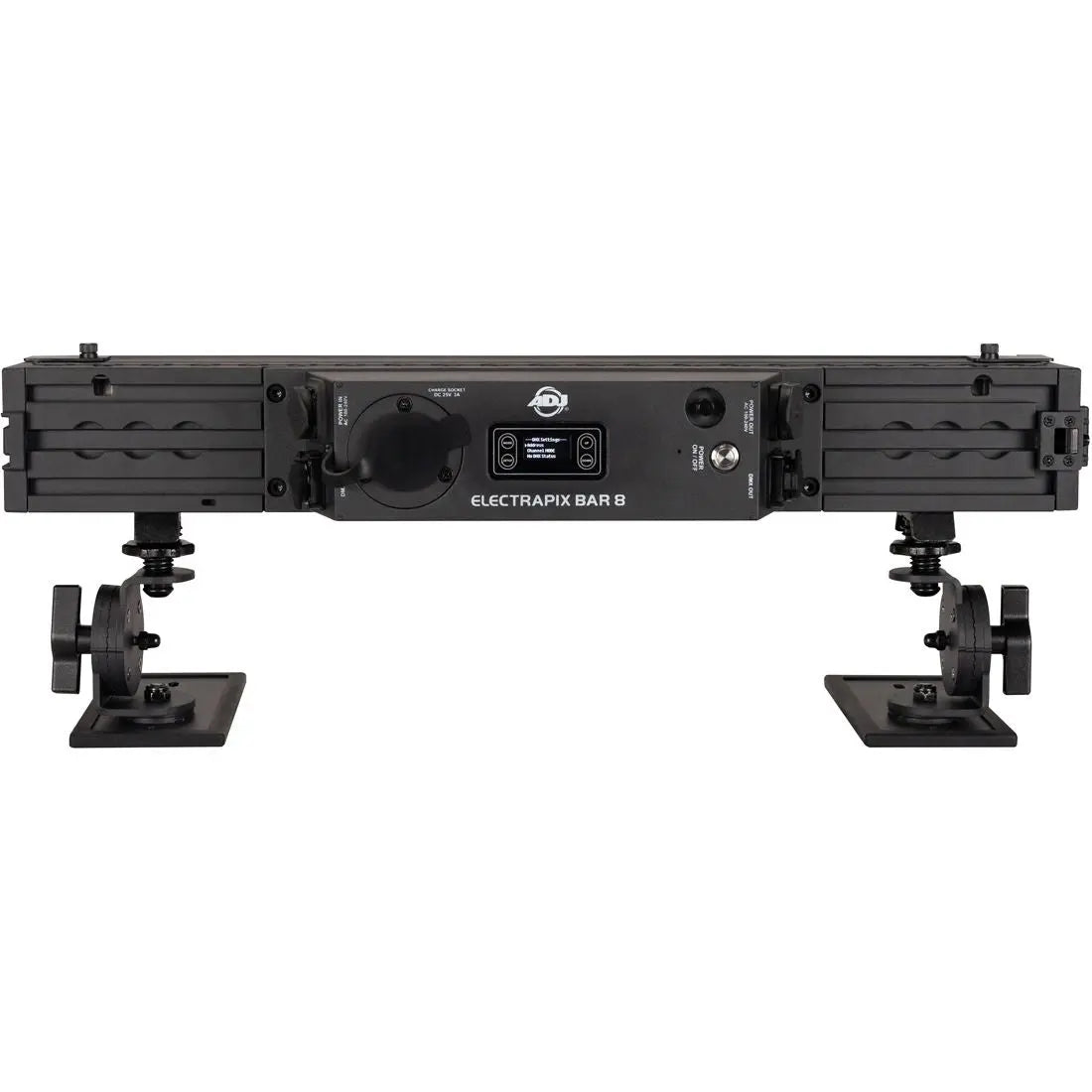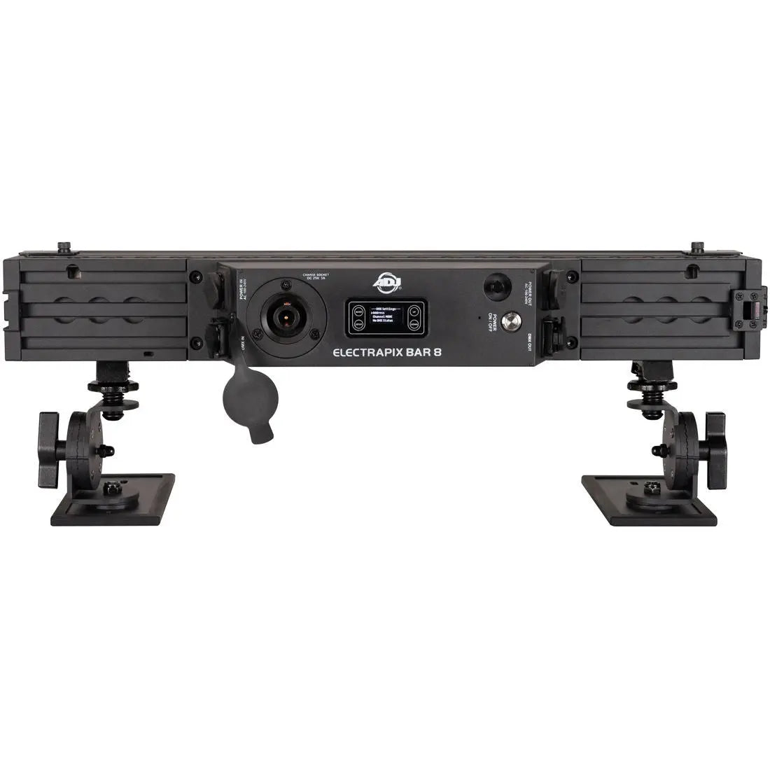 IP65 Housing OLED Digital display L Track system for locking accessories / rigging Glare Shield Diffusion Filter slot Angle adjustable feet Horizontal slide lock to attach additional ElectraPix Bar 8 or ElectraPix Bar 16