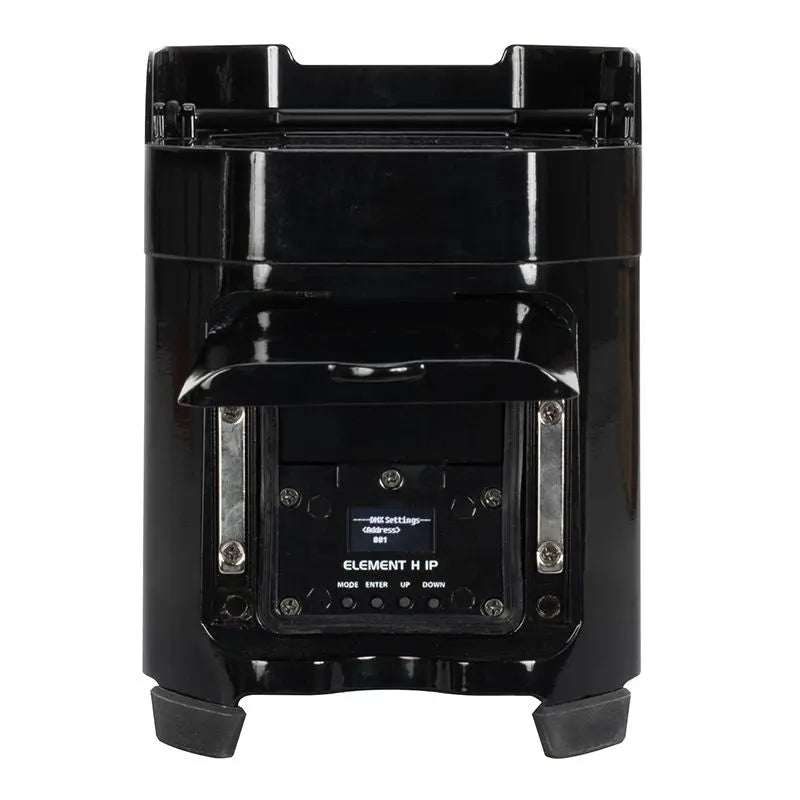 The ADJ Lighting Element H IP is a high-performance battery-powered wireless DMX-controlled uplighting fixture with advanced features suitable for various events such as weddings concerts theatres and more. Housed in a shiny black rugged metal casing with four 20-Watt RGBAW+UV LEDs it creates vibrant and dynamic lighting effects that can be controlled remotely through Wireless DMX. Its built-in Wireless communication protocol ensures a stable and secure connection allowing you to control the lighting fixtures from up to 2500ft/700m away.