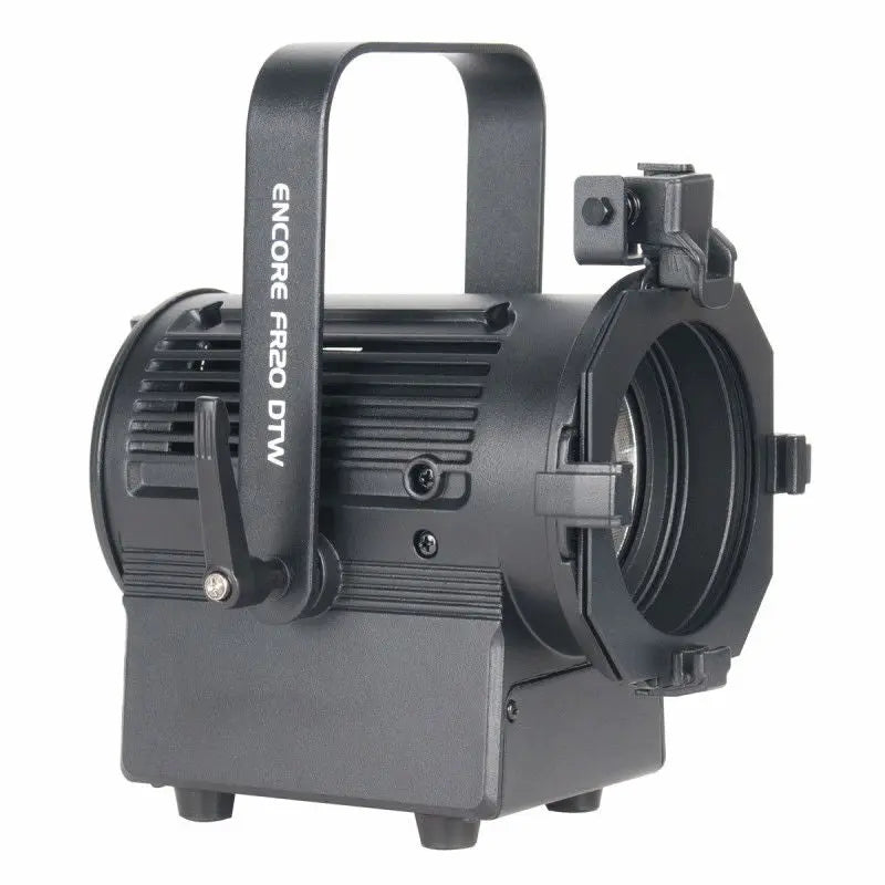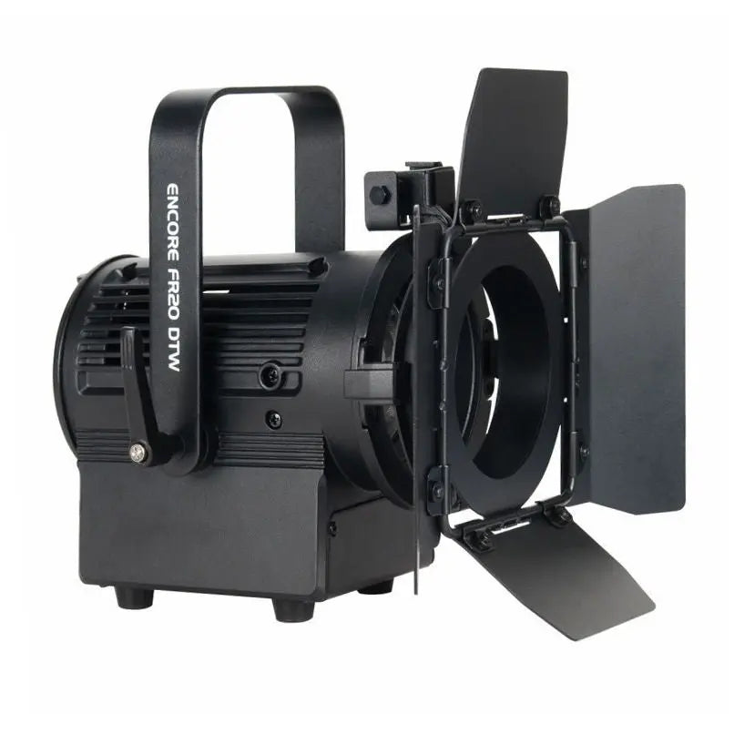 Part of the Encore stage lighting series the Encore FR20 DTW lighting fixture is equipped with a 2-inch Fresnel lens and powered by a 17W warm white LED engine. It produces a soft-edged beam for stage theatre and commercial use at 3000K. It comes with barn doors to adjust the beam dispersion and a manual knob to change the dimming from 100% to 0% with a dim to warm feature. It is also Triac dimmable - compatible with ADJ dimmer packs or standard wall dimmers.