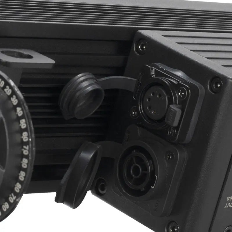IP65 Rated: Ingress Protection against liquid snow dust and sand All metal construction IP Rated rubber covers protect In/Out Locking Power connectors and IP rated 5⚊pin sockets Locking outdoor IN/Out Power connectors Data linkable via 5⚊pin DMX connections Includes glare shield