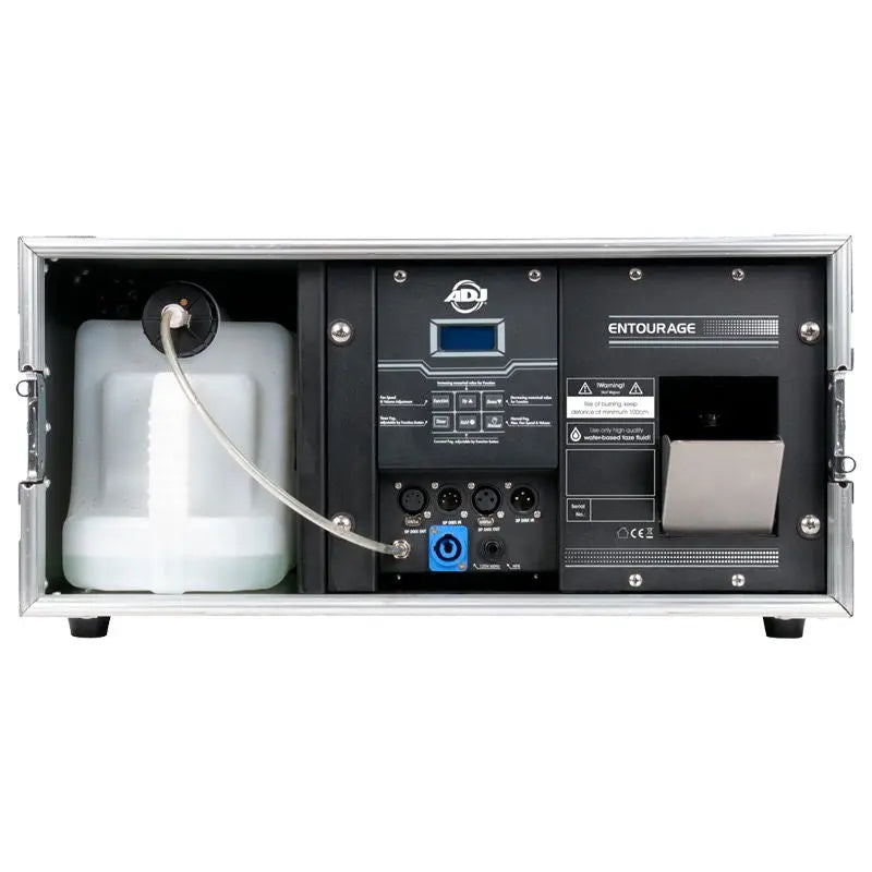 The ADJ Entourage is a professional grade touring Faze Machine built into a durable flight case. This pro Fazer offers a very quick warm-up time and produces a massive amount of atmosphere. The Entourage features an easy to read LED function display with fog timer continuous fog and manual fog options. Connections include 3-pin and 5-pin DMX and Locking Power AC input. Uses high quality water based fog fluid.