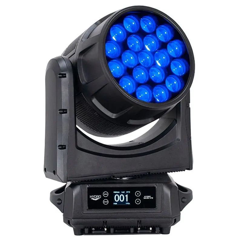 The ADJ Hydro Wash X19 is an IP65 rated 760W professional moving head wash fixture with nineteen 40W RGBW (4-IN-1) LEDs.