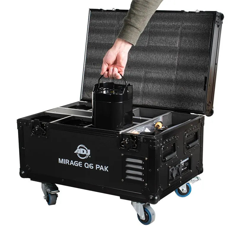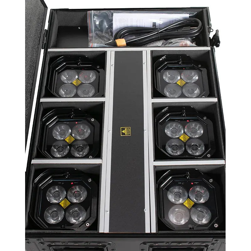 The ADJ Lighting Mirage Q6 Pak Black is an all-in-one event up lighting system with six (6) IP65 rated for outdoor or indoor use battery powered fixtures and a durable flight case with an on-board battery charging solution.