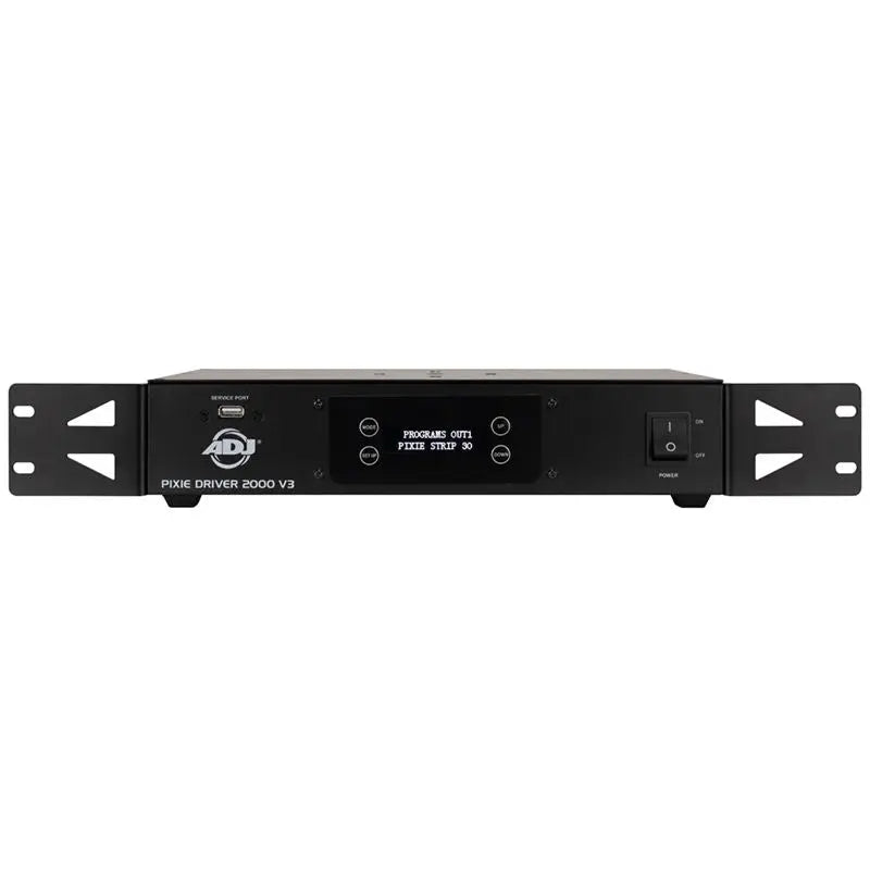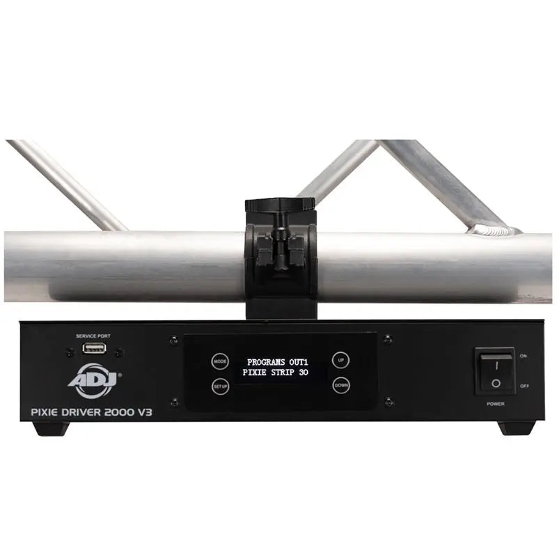 The Pixie Driver 2000 V3 features a universal auto switching power supply (100-240V) a 4-button LCD control menu display locking RJ45 Ethernet in/out ports and (2) outputs which use proprietary 4-pin combo cables (sold separately) that supply power and data to each pixel strip (available in lengths from 30 cm to 15 m). The Pixie Driver 2000 V3 can be mounted in a standard 19-inch rack (rack ears included) or attached to truss with a clamp (not included). There is a USB port on the front panel to easily make updates to the firmware.