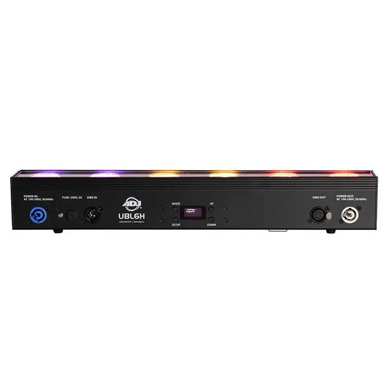 The ADJ Lighting UBL6H from the unrivalled Ultra Series is a professional-grade lime-infused half meter HEX LED linear fixture that sets a new standard in event lighting. Powered by six ultra-bright 20-Watt HEX LEDs (Red Green Blue Amber Lime and UV) this fixture is a versatile powerhouse that seamlessly blends colour with precision.