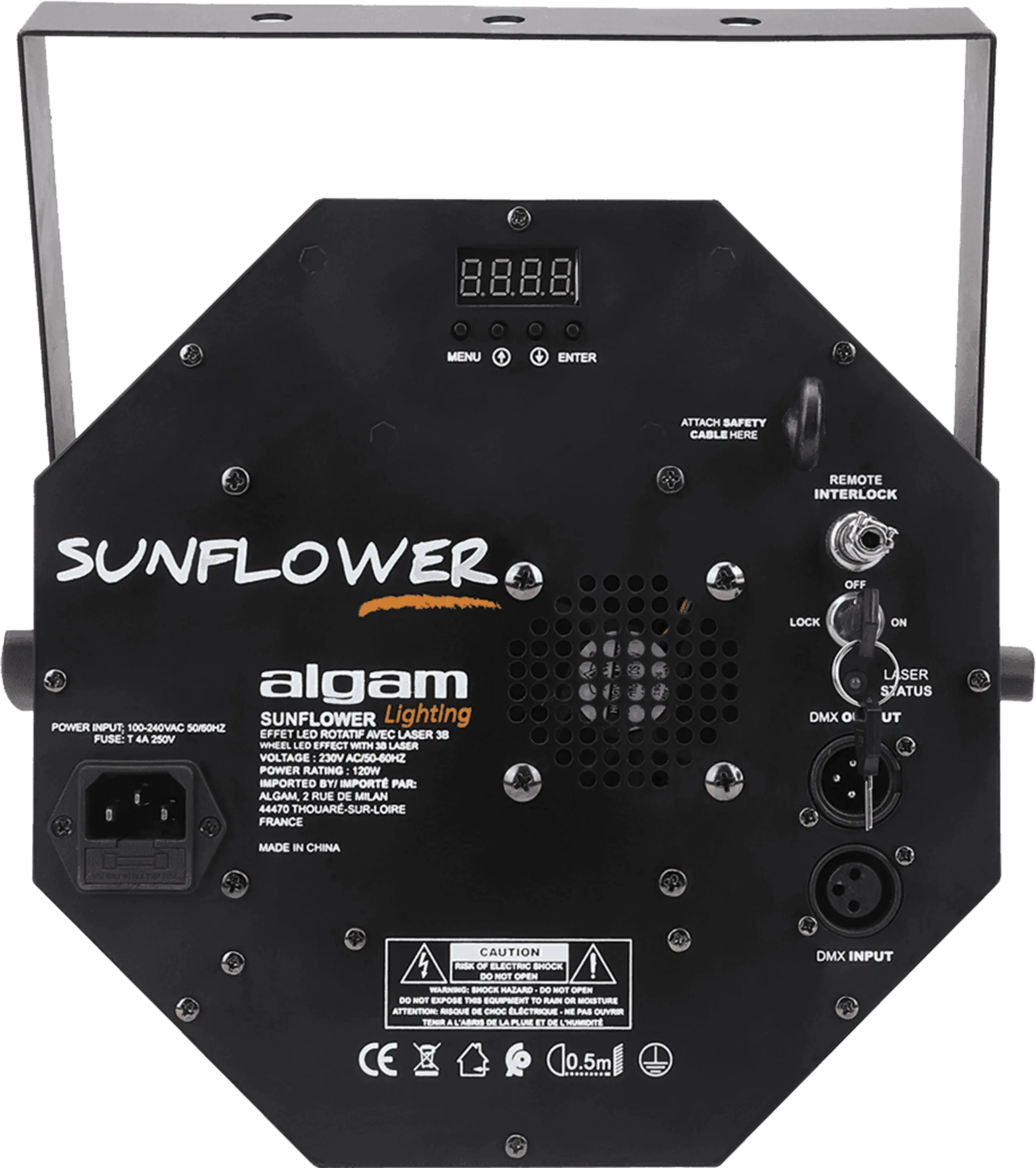 The Algam Lighting Sunflower is a multi-purpose LED effect light that surprises with its ability to cover large spaces through three complementary effects, ensuring a great diversity of animations. Ideal for DJs and mobile discos, it combines a rotating prism with 18 RGB LEDs, a powerful strobe, and a 150mW green laser to create incredibly powerful multi-color effects for animating dance floors at weddings, private parties, and more. Easy to use, it offers numerous internal programs, master/slave mode, and DMX control for precise management of its dynamic and impressive capabilities.