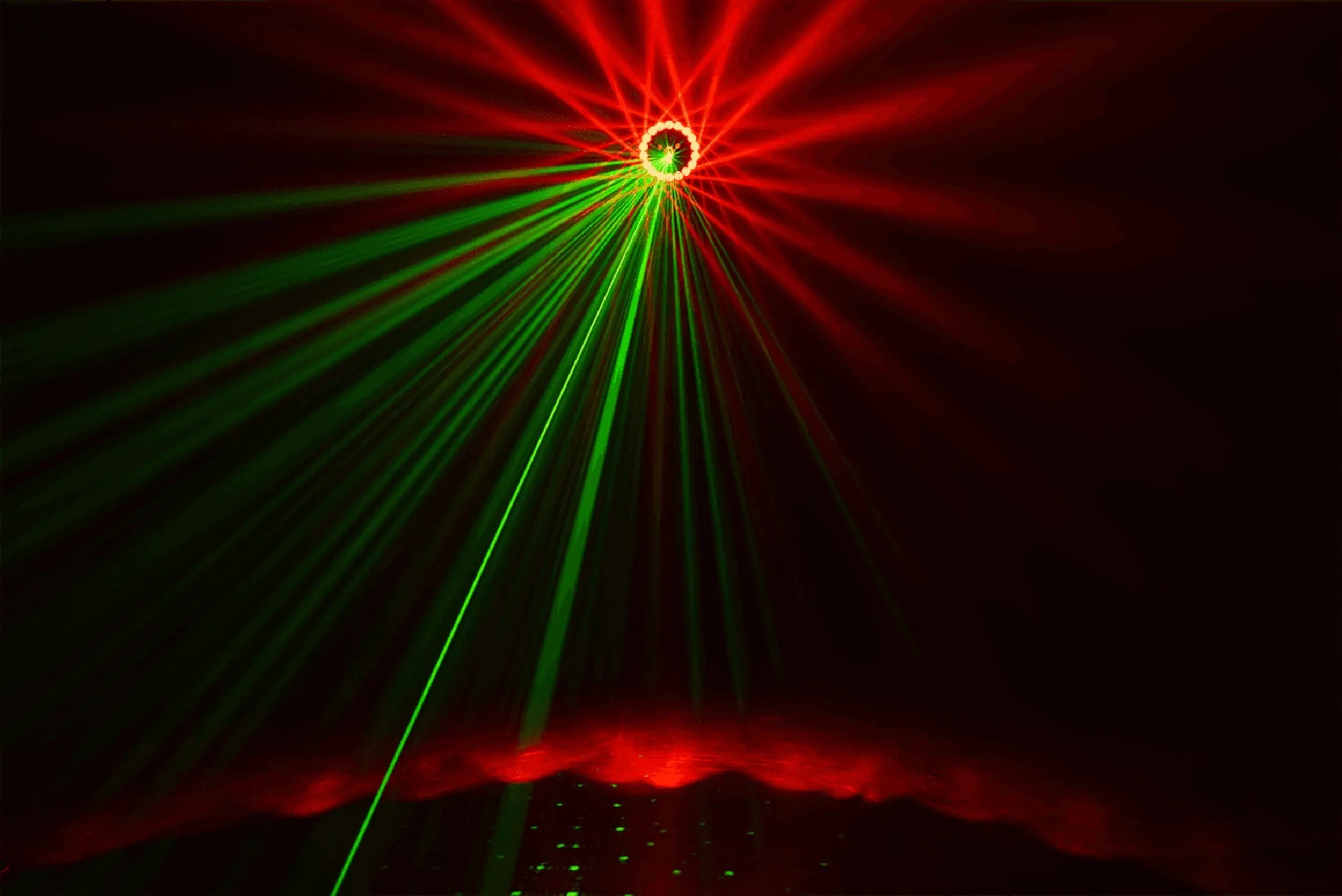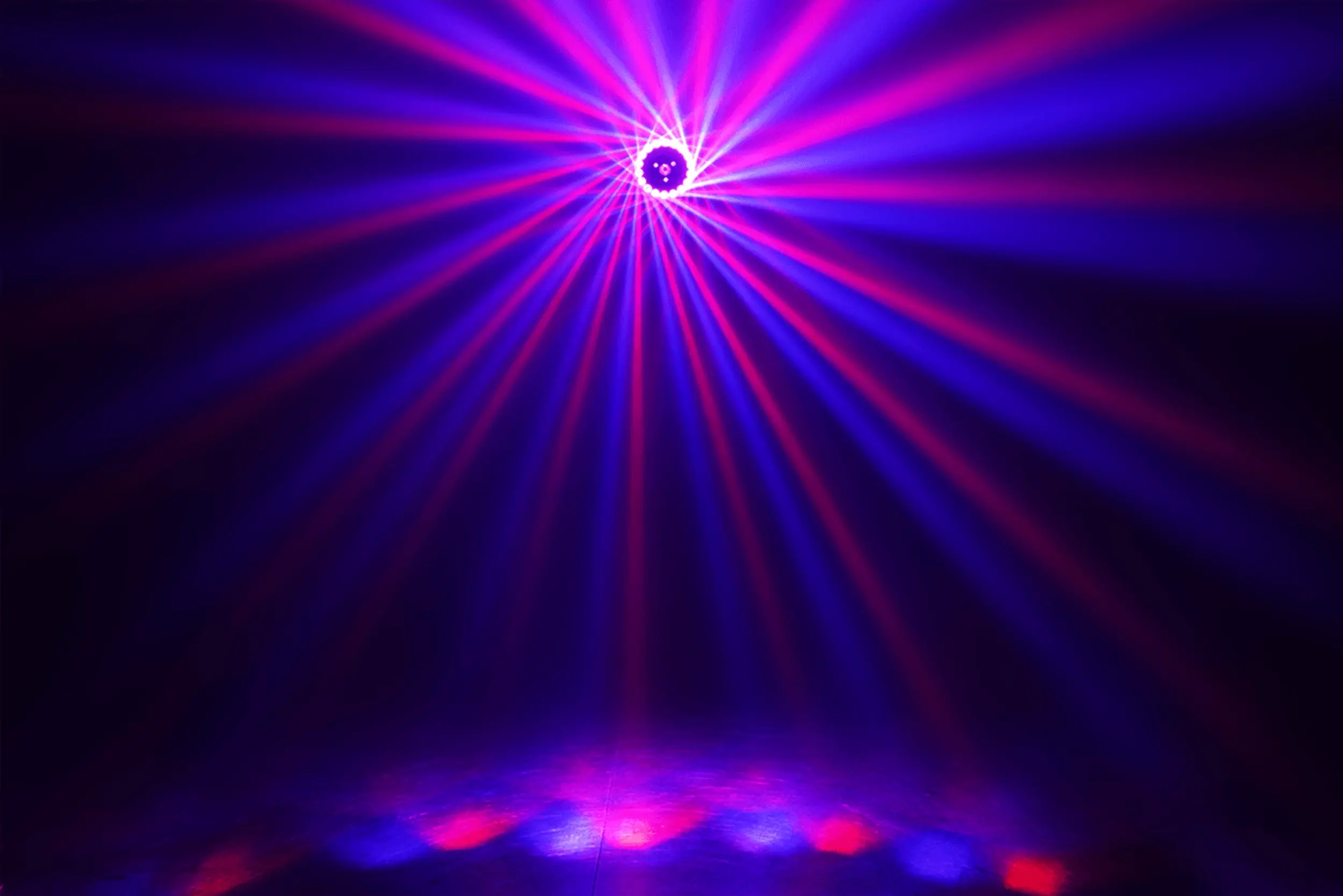 Three Complementary Effects: Combines a Sunshine effect (18 x 3W RGB LEDs with rotating prism), a Strobe effect (3 x 20W white LEDs), and a Laser effect (150mW green).