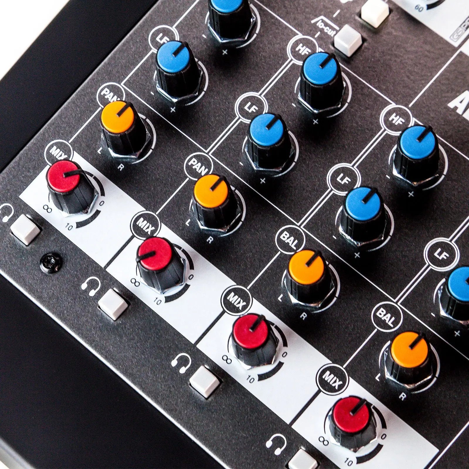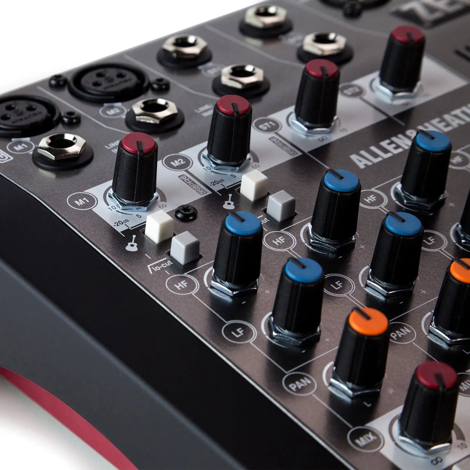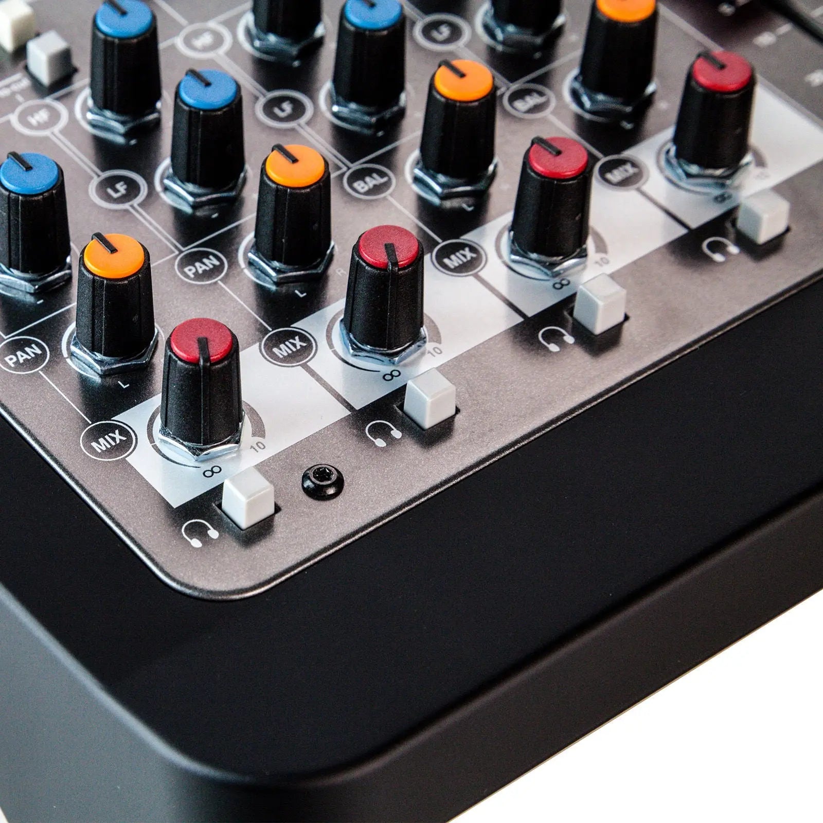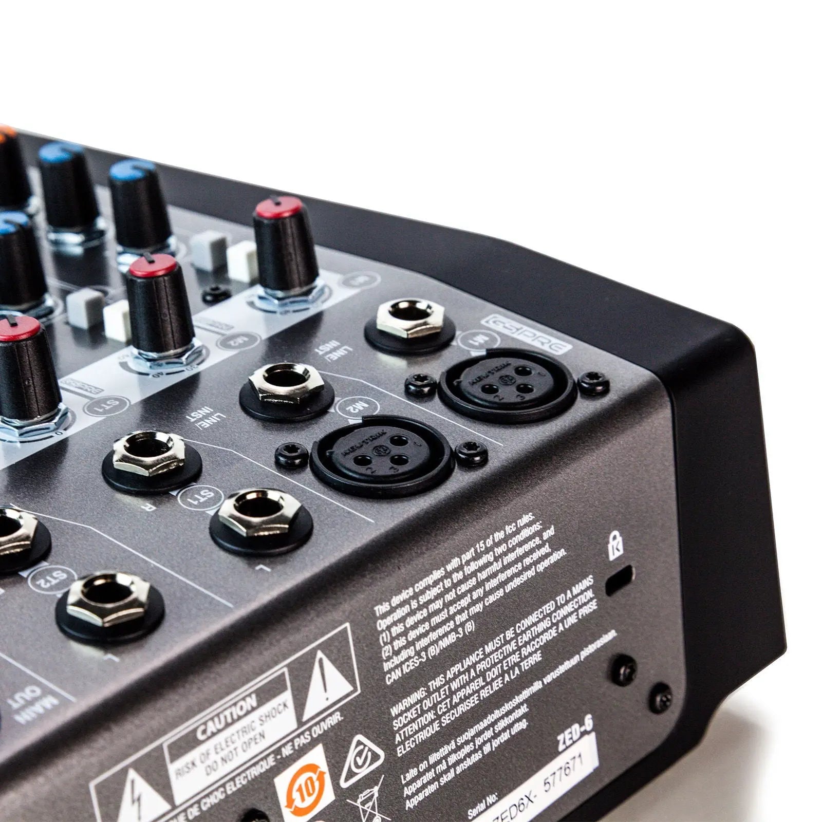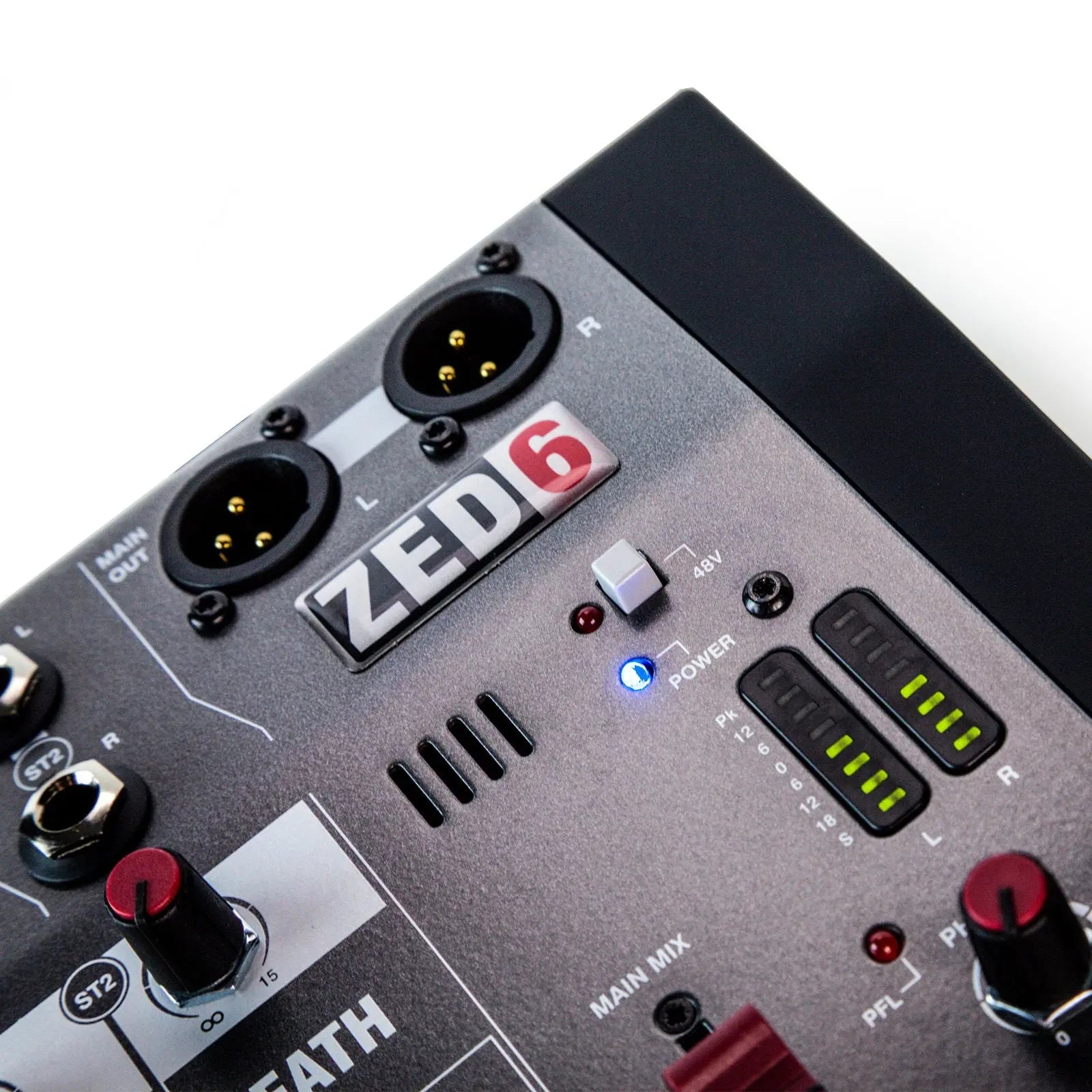 The Allen & Heath ZED-6 is a premium compact stereo mixer designed for musicians podcasters and small venues. Featuring two mono channels with GSPre preamps two stereo line inputs and flexible I/O it delivers studio-quality sound in a rugged portable format. With a 2-band EQ guitar-level input compatibility and all-metal construction the ZED-6 is the perfect analog mixer for small gigs home studios and mobile setups where audio clarity and durability matter most. 2 mono channels with GSPre preamps for studio-grade sound 2 stereo line inputs for playback devices or keyboards XLR and TRS jack inputs for flexible connectivity High impedance switch for guitar-level signals (channels 1 & 2) 2-band EQ on mono channels All-metal chassis for rugged build quality Independent headphone output with level control Compact and lightweight design for easy transport