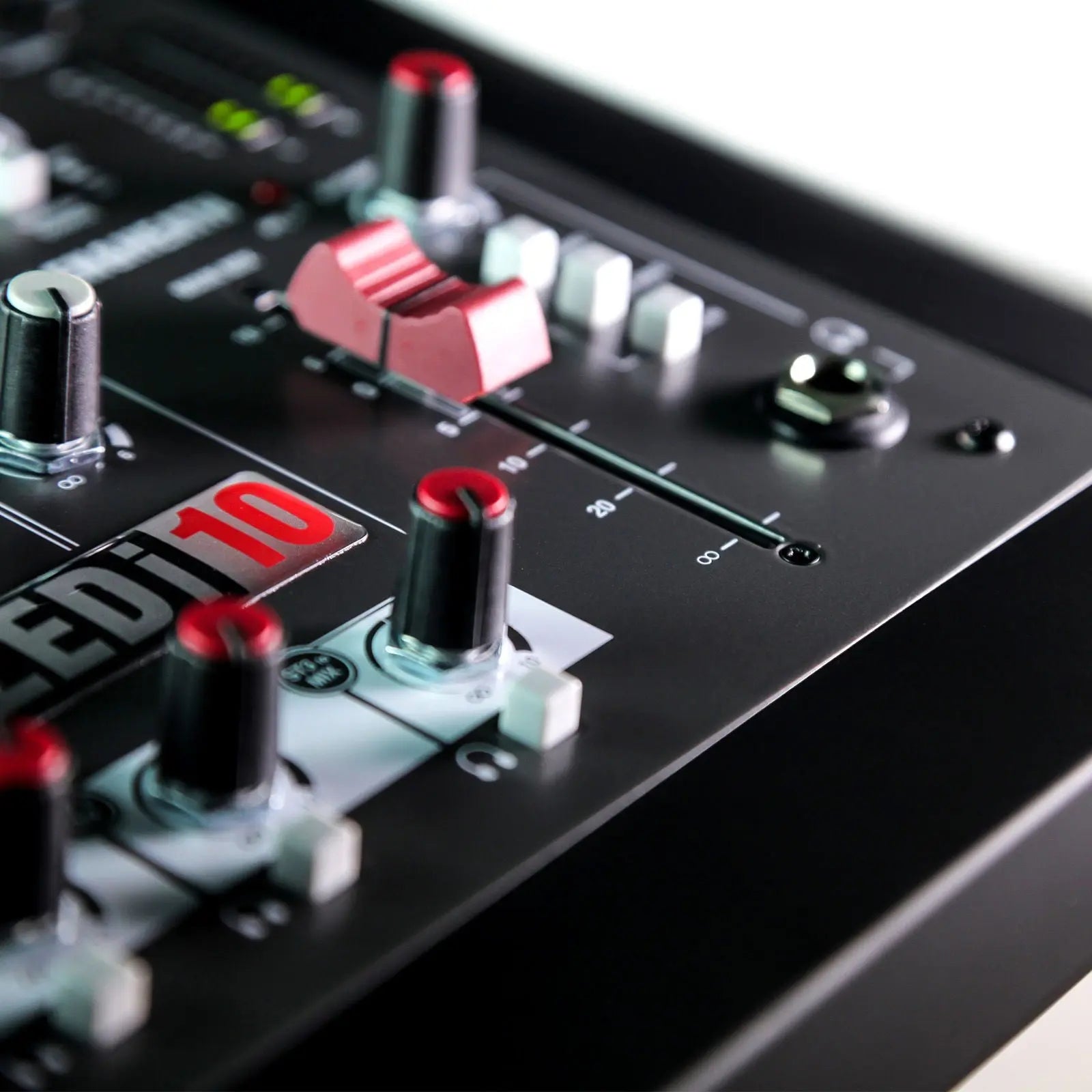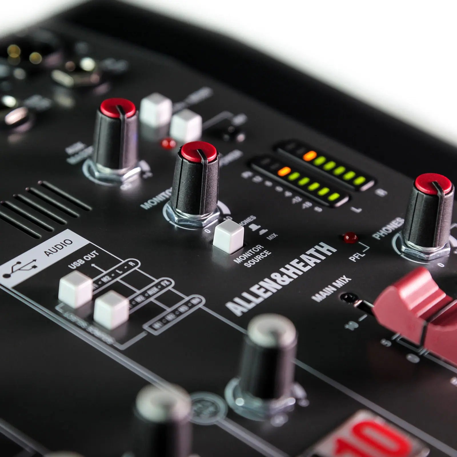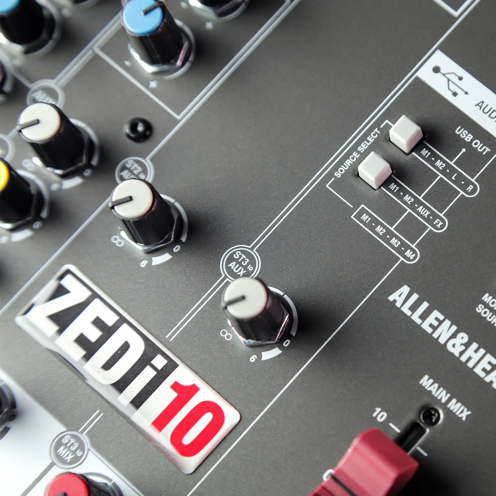 The Allen & Heath ZEDi-10 is a compact 10-channel hybrid mixer combining premium analog mixing with a professional 4-in/4-out 24-bit/96kHz USB audio interface. Designed for musicians podcasters and live performers it features four GSPre mic/line inputs two stereo line inputs Hi-Z instrument-ready channels and intuitive EQ control. Ideal for recording streaming and small venue mixing the ZEDi-10 includes Cubase LE software and offers reliable studio-grade performance in a portable all-metal chassis. 4 mono mic/line inputs with GSPre preamps for high-quality sound 2 stereo line inputs for keyboards and media players 24-bit/96kHz USB interface for seamless recording and playback Hi-Z inputs on mono channels for direct instrument connection 3-band EQ on mono channels and 2-band EQ on stereo channels 48V phantom power for condenser microphones Rugged all-metal chassis for durability Smooth 60mm main mix fader for precise control Includes Cubase LE and Cubasis LE software