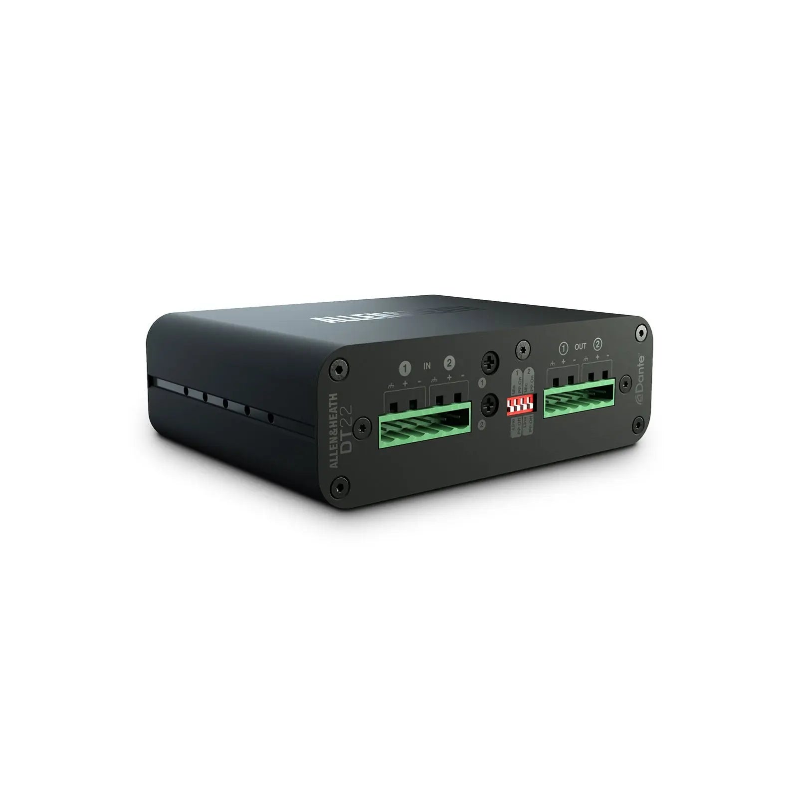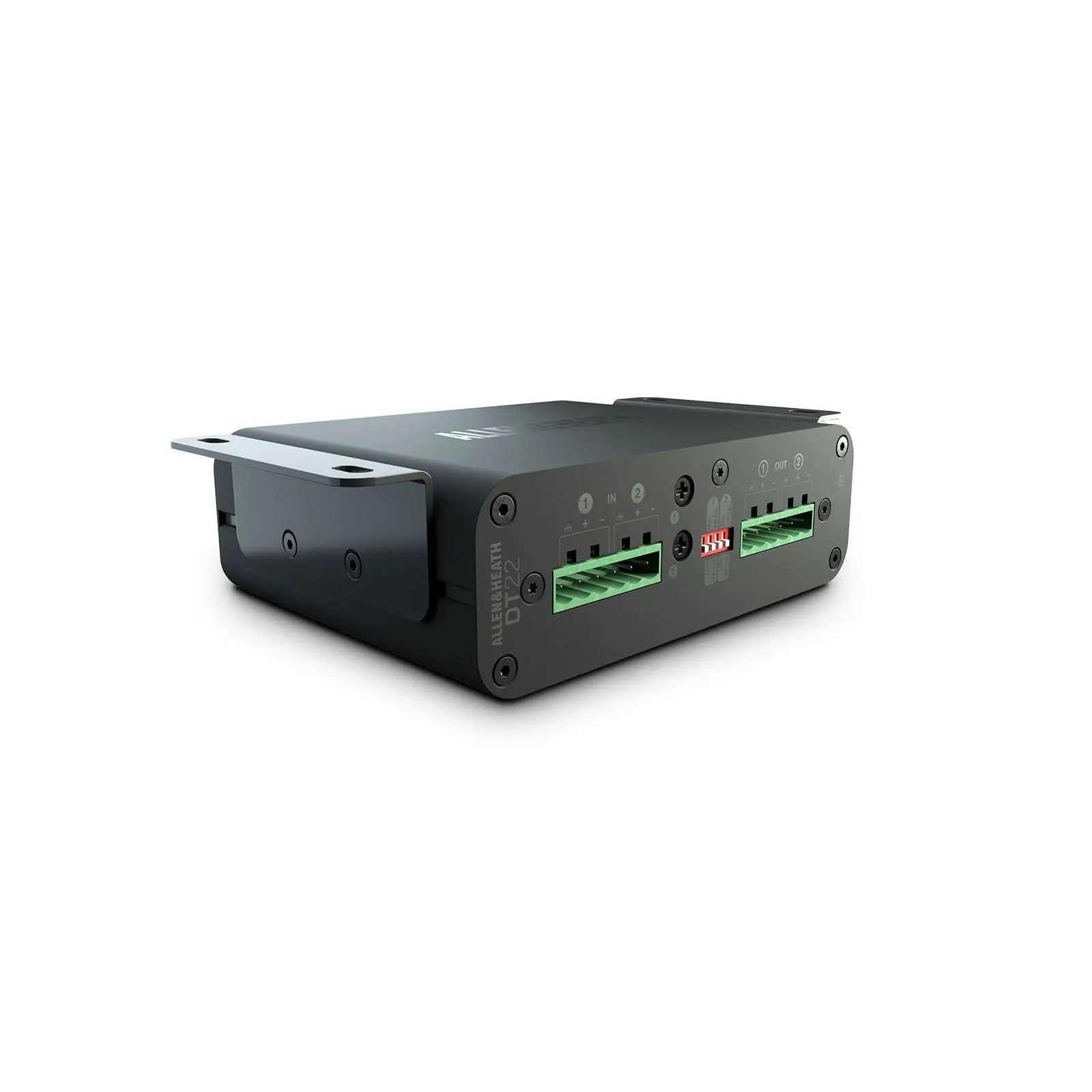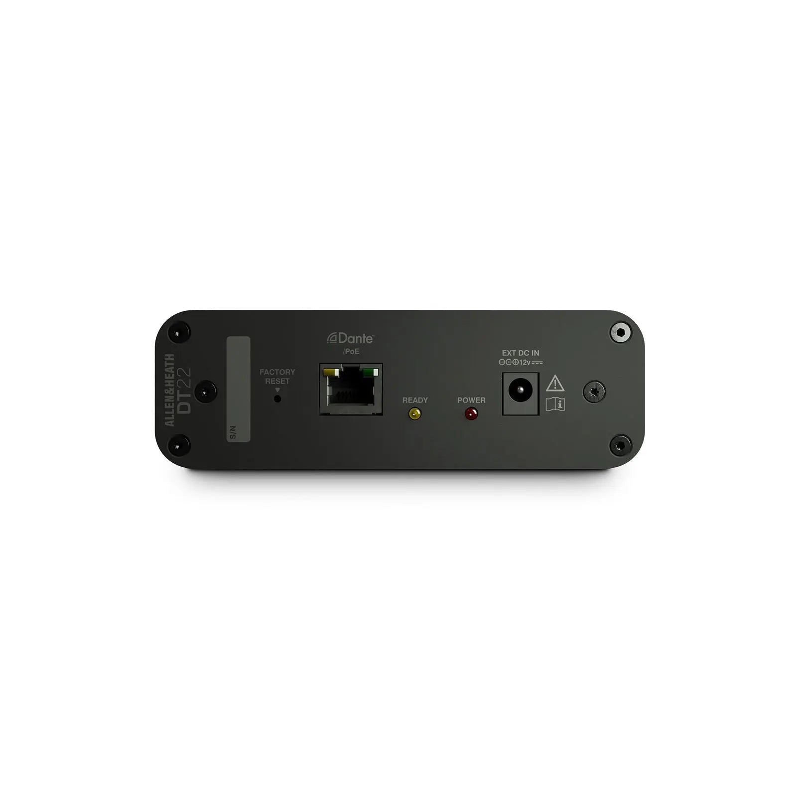 The Allen & Heath DT22‑M is a compact rugged Dante and AES67‑compatible I/O interface with 2 balanced mic/line inputs (Phoenix/Euroblock) and 2 balanced line outputs. This PoE‑powered variant is perfect for fixed installations—no PSU included—while supporting audio at 48 or 96 kHz. With local gain control phantom power surface‑mount ears and optional rack mounting it's ideal for education corporate hospitality and AV systems. 2 mic/line inputs + 2 line outputs via Phoenix/Euroblock Supports 48kHz & 96kHz audio Local gain and mic/line switching with +48 V phantom PoE‑powered (802.3af 15 W) or 12 VDC optional AES67 and Dante Domain Manager ready Surface‑mount ears included; rack‑mount with DT‑RK19 Rugged aluminium housing 0–40 °C operating range
