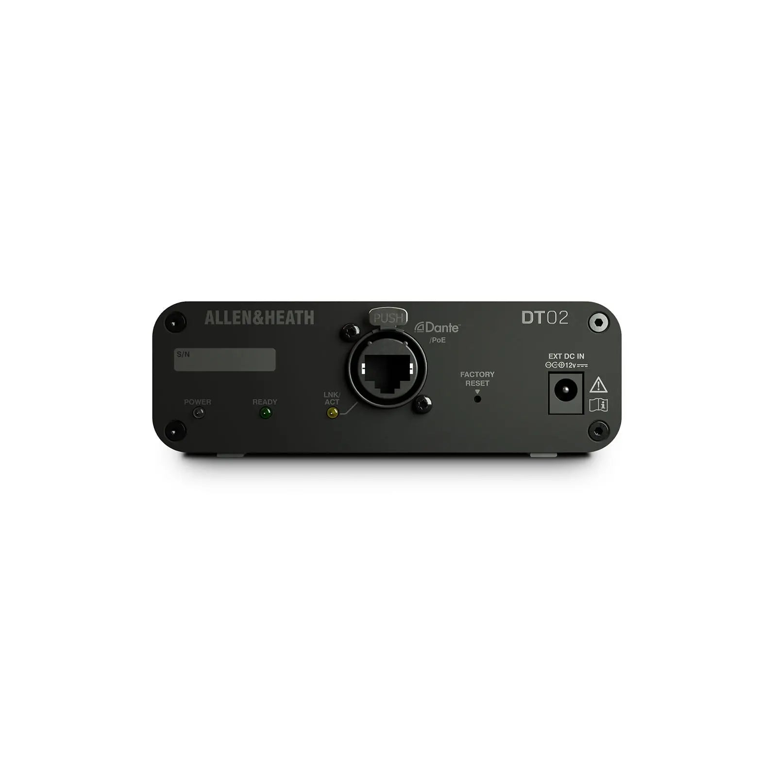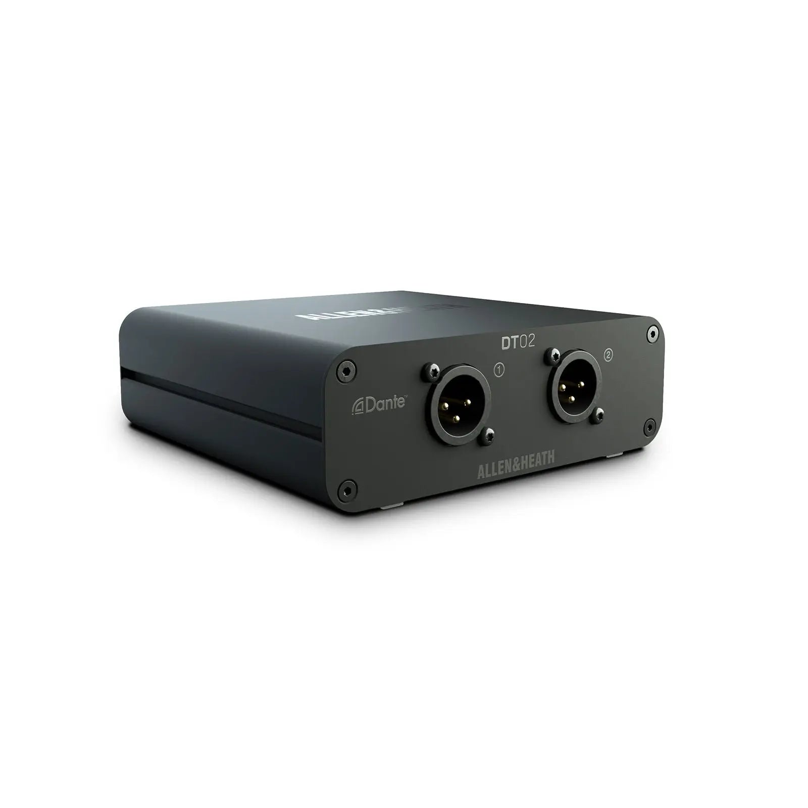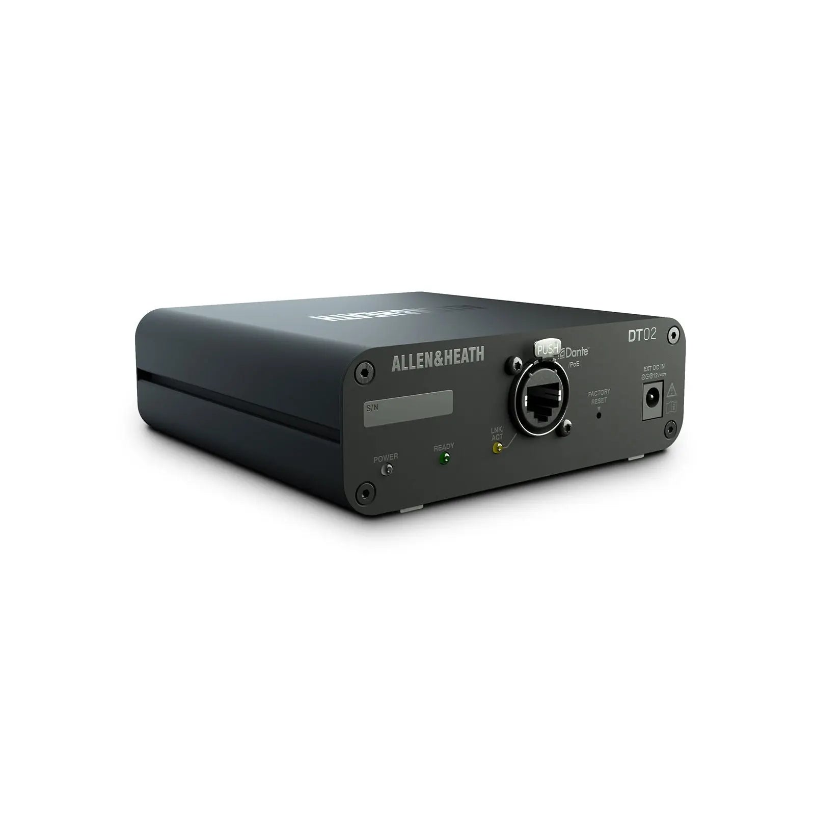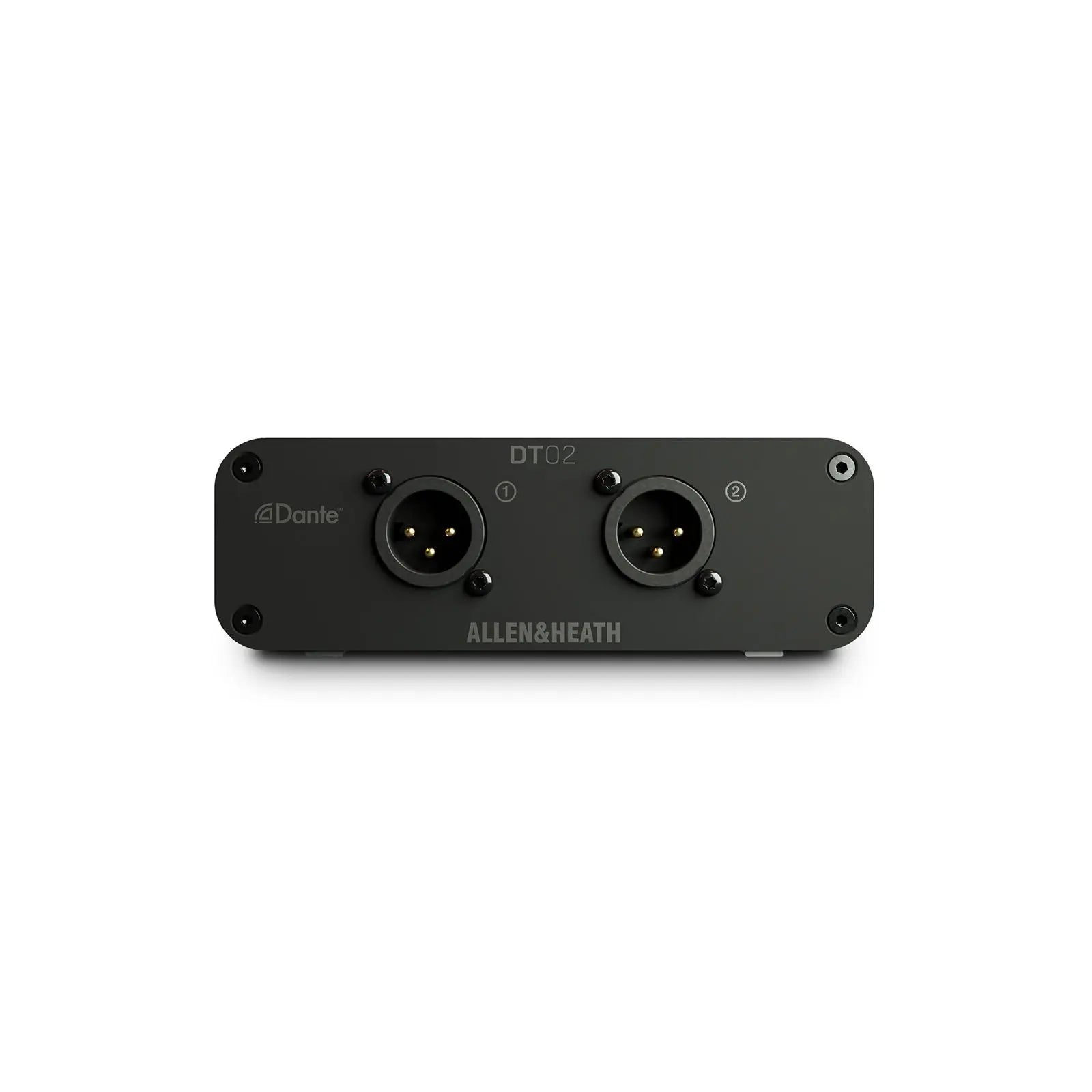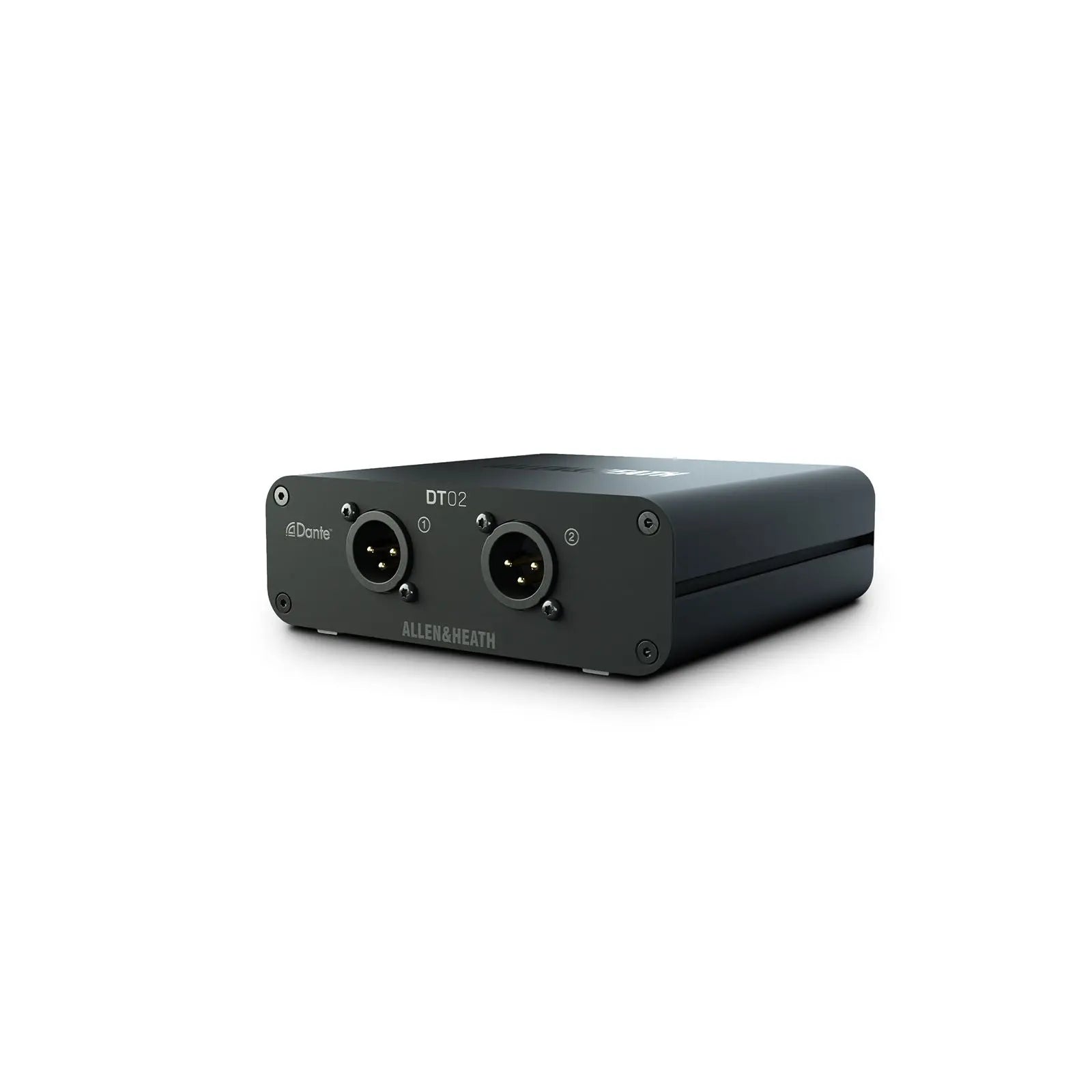 The Allen & Heath DT02 is a compact Dante output interface offering 2 balanced line-level XLR outputs for audio distribution in Dante-enabled systems. Designed for installed AV corporate education and live sound applications the DT02 delivers high-quality audio over standard network infrastructure. It can be wall or floor mounted and includes an external PSU making it a flexible and practical choice for routing audio to powered speakers amplifiers or other audio destinations within a Dante network. 2 balanced line-level XLR outputs Audinate Dante audio-over-IP connectivity Ideal for sending audio to powered speakers or amps Includes external PSU Compact design for floor or wall mounting Perfect for installed AV and live sound environments AES67 compliant