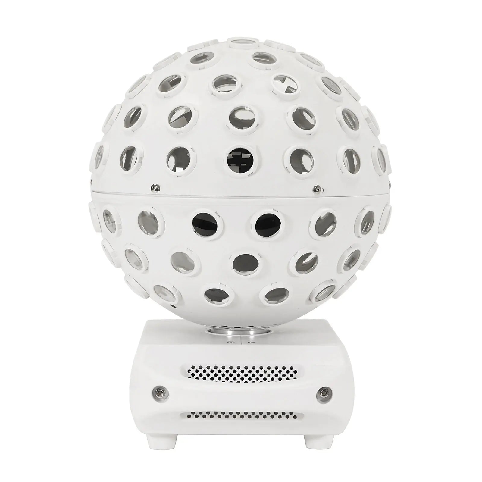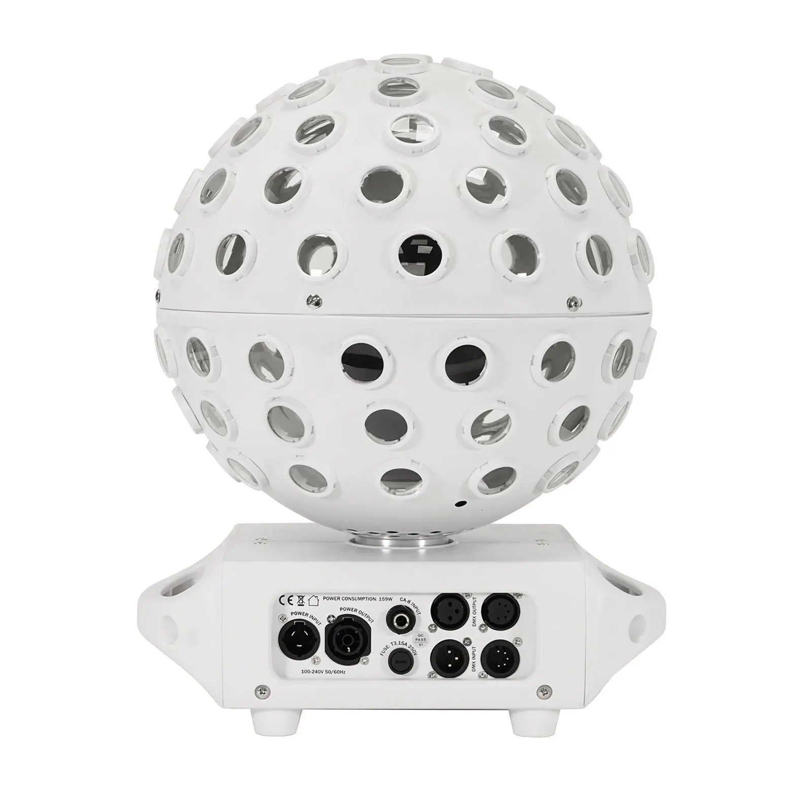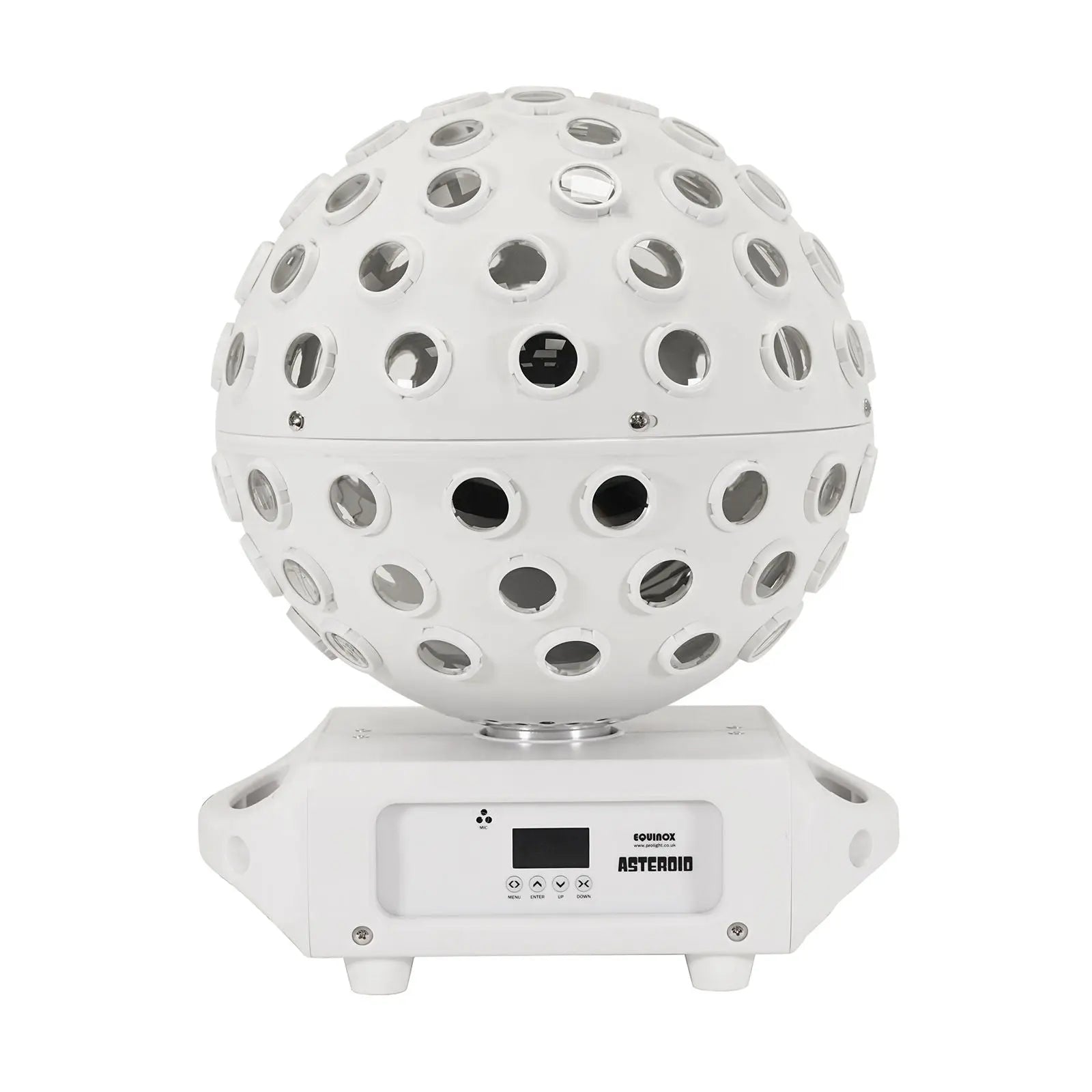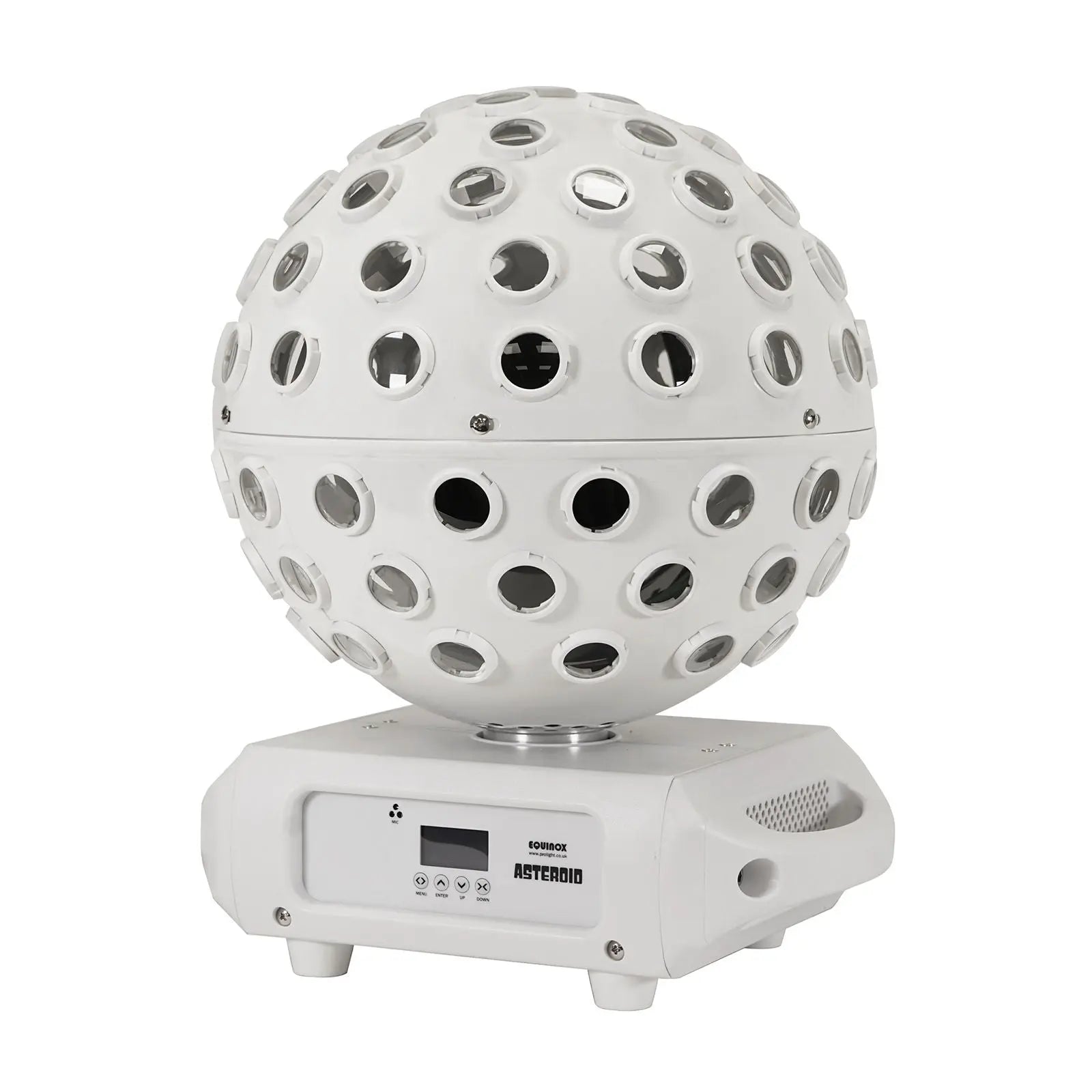 The Equinox Asteroid White is a high output centrepiece featuring 5 x 40W quad-colour RGBW LEDs producing 98 pin sharp 2° beams. 5 section colour control allows for multiple colour combinations to be created and thanks to clever programming the LEDs chase around the ball generating a variety of multi-beam room filling effects. Versatile and user-friendly the unit offers sound active primary/secondary and DMX modes along with built-in programs selectable via the 4 button display. For added convenience it can also be controlled using a CA 8 controller (sold separately). 5 x 40W quad-colour LEDs (RGBW) 98 pin sharp 2° beams 5 section control producing multiple colour combinations Multi-beam room filling effect DMX channels: 4/7/15/23 or 31 selectable Auto sound active and primary/secondary modes plus built-in programs 0 - 100% dimming Variable strobe Optional CA 8 controller Supplied with quick release omega clamp 4 button menu with OLED display PowerTwist TR1 input/output 5-Pin XLR input/output 3-Pin XLR input/output Fan cooled
