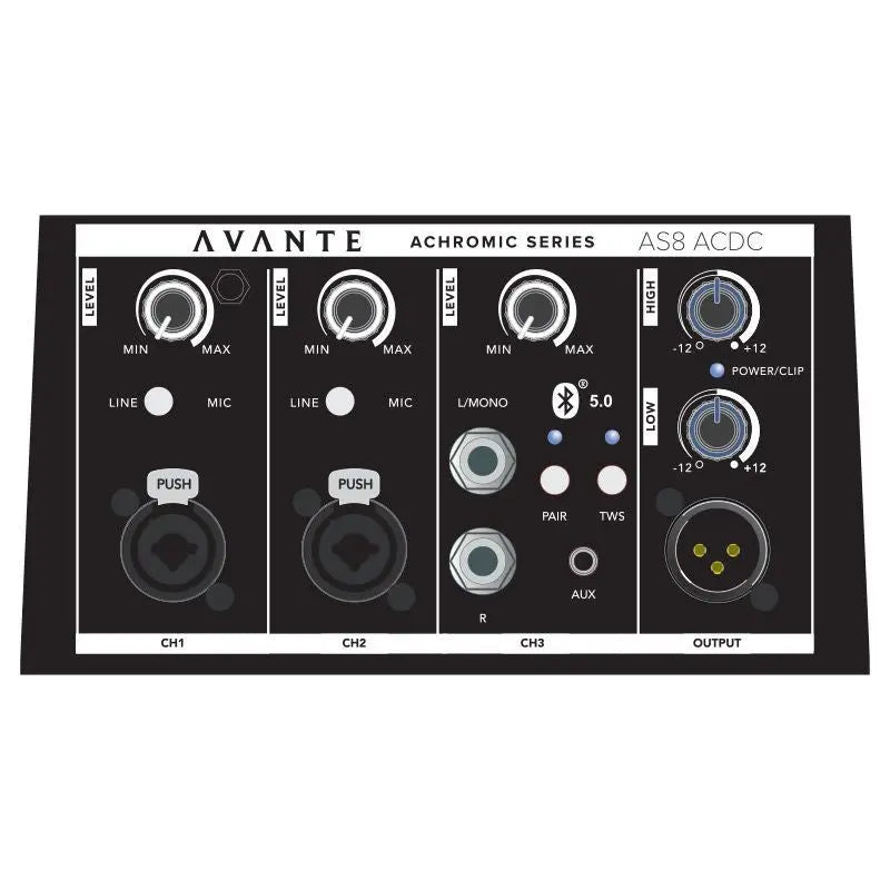 The AS8 ACDC active column system from Avante Audio the perfect portable sound system for small venues acoustic performers and mobile entertainers. With its fully-featured and easy to set up design this system comprises an 8-inch neodymium subwoofer enclosure and two column units one loaded with six precision-aligned 2.75-inch neodymium drivers and the other serving as a spacer to lift the speaker column to optimal height.