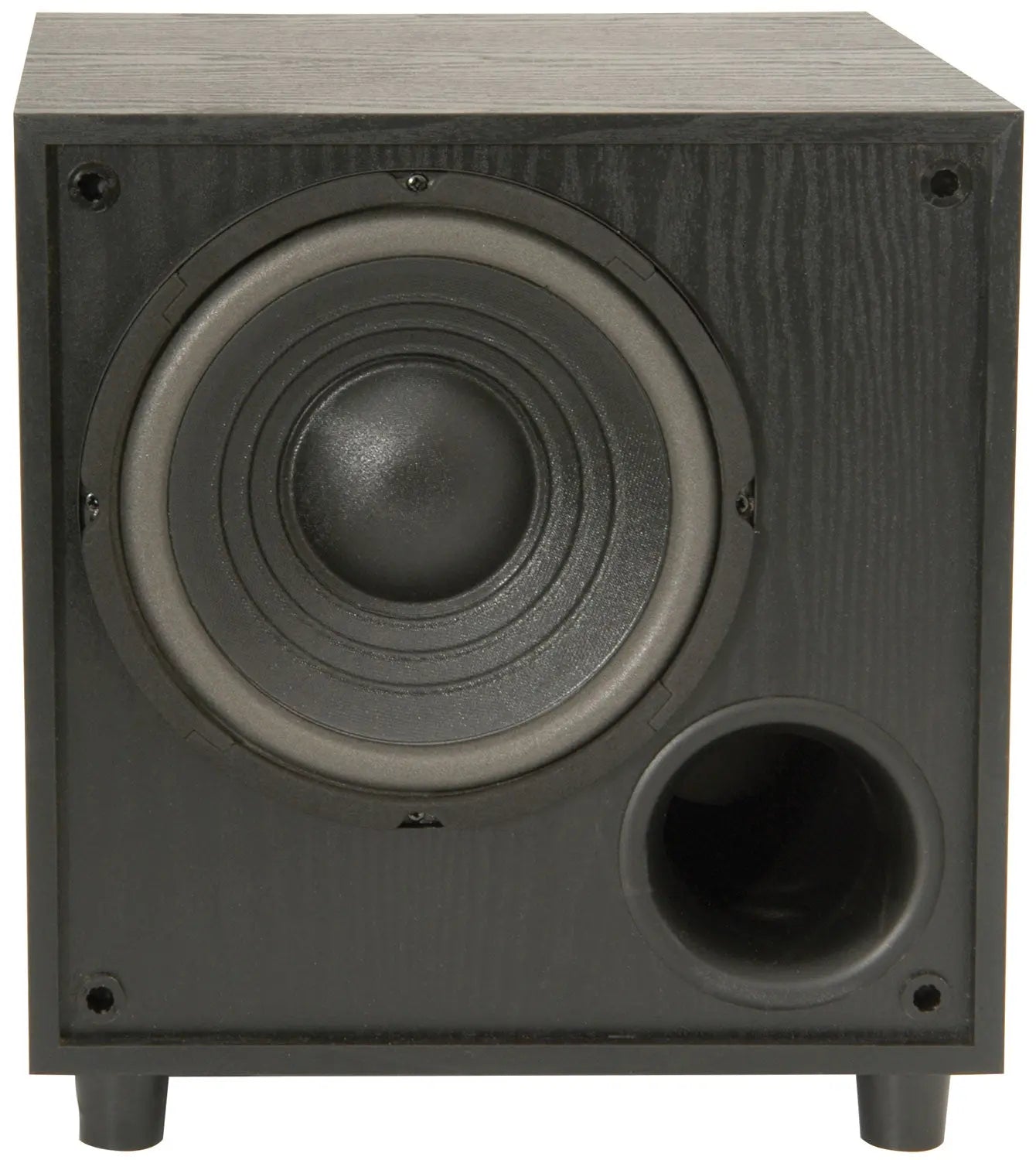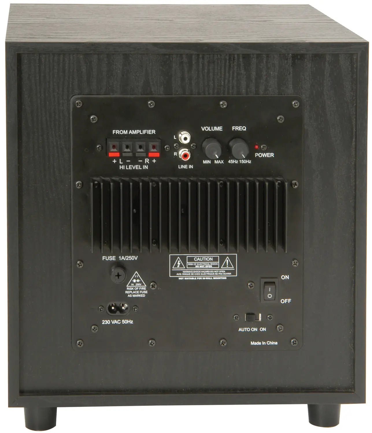 Active sub cabinet with 8" (20cm) reinforced driver and internal amplifier with active filter circuit. Inputs are on twin RCA or from a stereo amplifier on spring terminals (between amp and mid-top speakers). Cutoff frequency and Gain rotary controls can be adjusted as required. "Auto Off" function deactivates the amplifier when no incoming signal is detected to conserve energy.