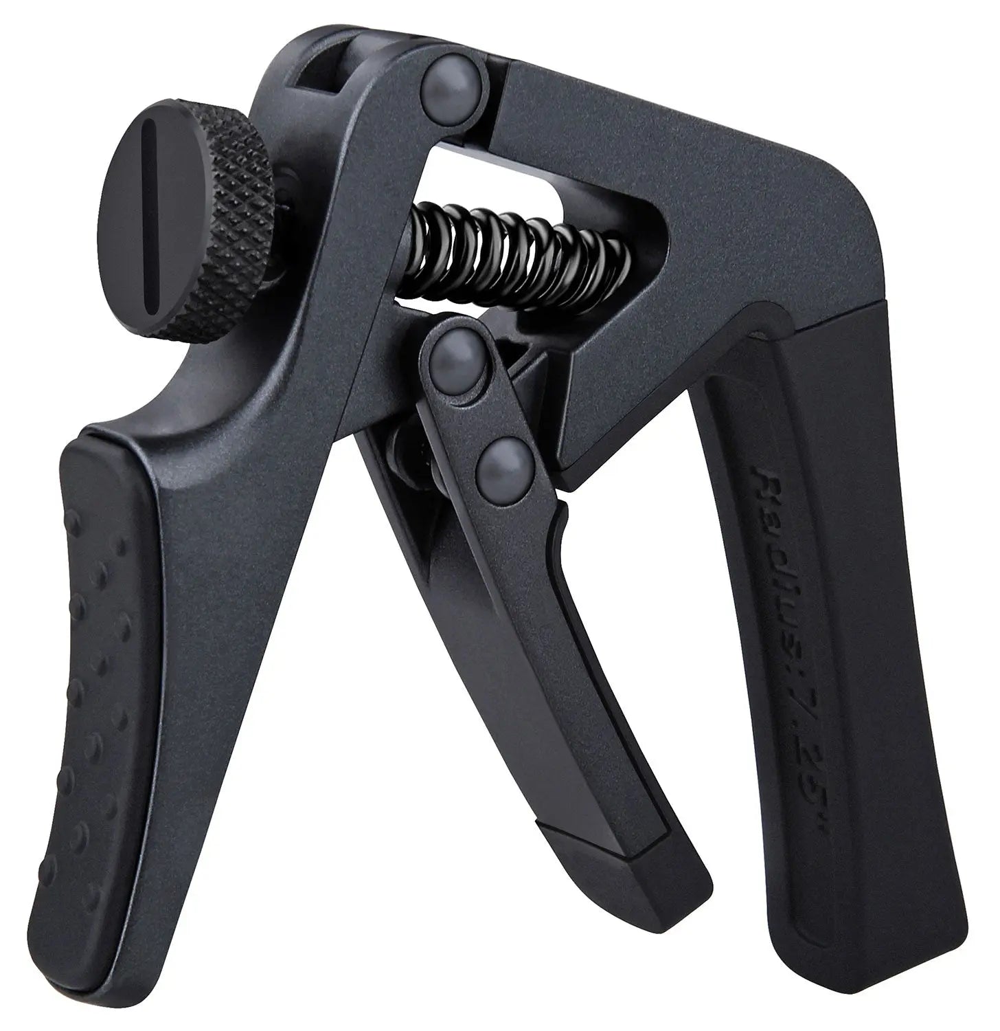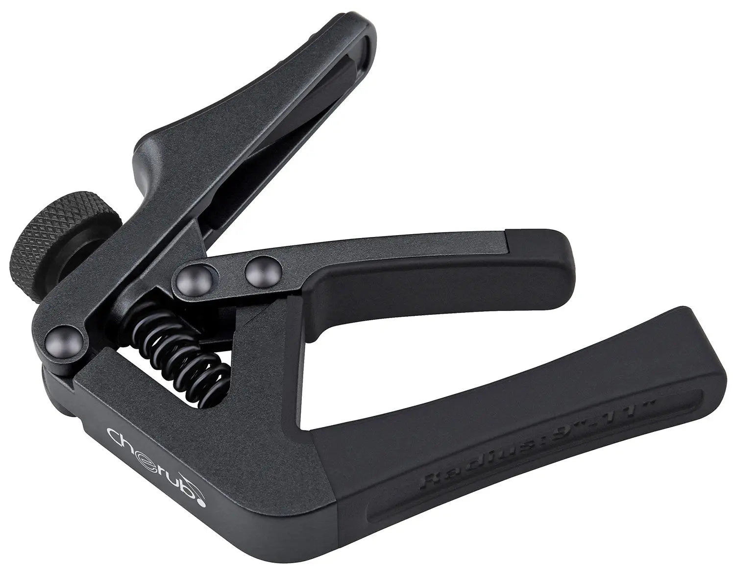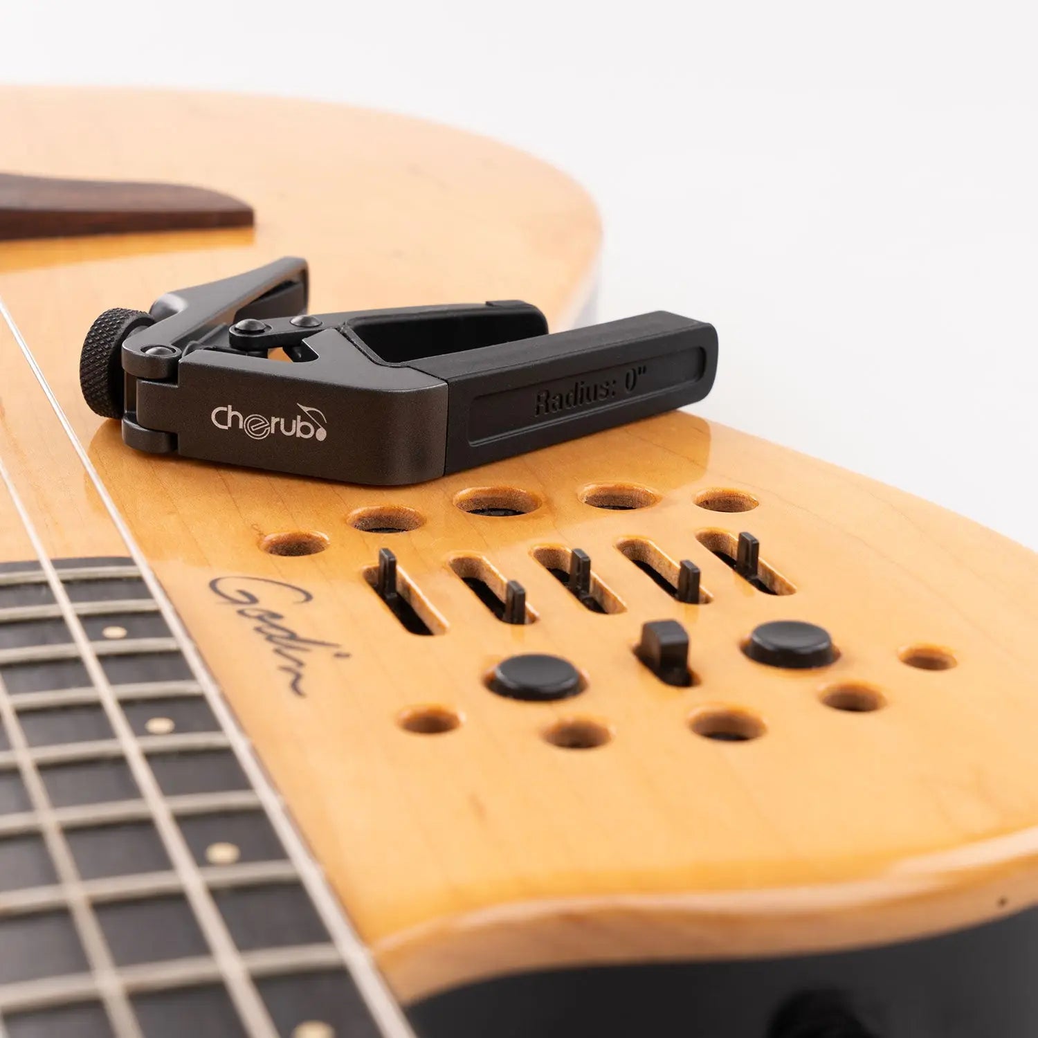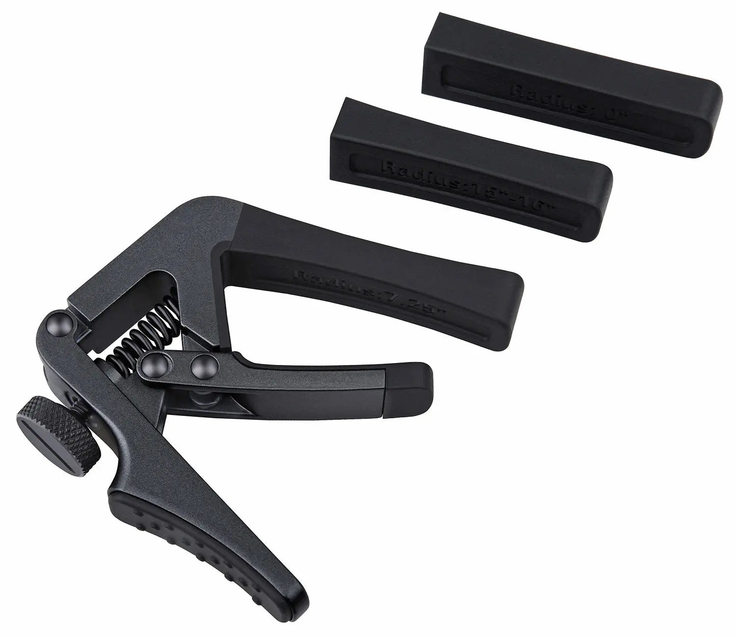 The Gemini capo is a unique design that can be adapted to fit a wide range of guitar types. Supplied with 3 removable clamp sleeves, each with 2 radius curves for a near-perfect fit to any of 6 completely different fingerboard profiles. A quick-release mechanism means that a simple squeeze is all that is needed to move or remove the capo and an adjustment wheel sets the tension versus neck thickness for the optimum pressure to hold the capo in place. One capo to suit many guitars.