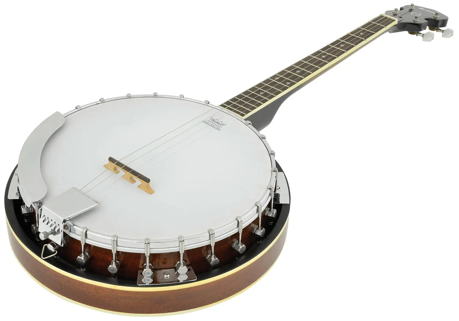 Traditional banjos for bluegrass and finger picking styles. Body rim and resonator are all mahogany, with a mahogany neck married to a hardwood composite fingerboard. A coated drum head forms the sound board and supports a floating bridge. Tuning is served by open geared tuners. Fully featured instruments for folk and country music genres.