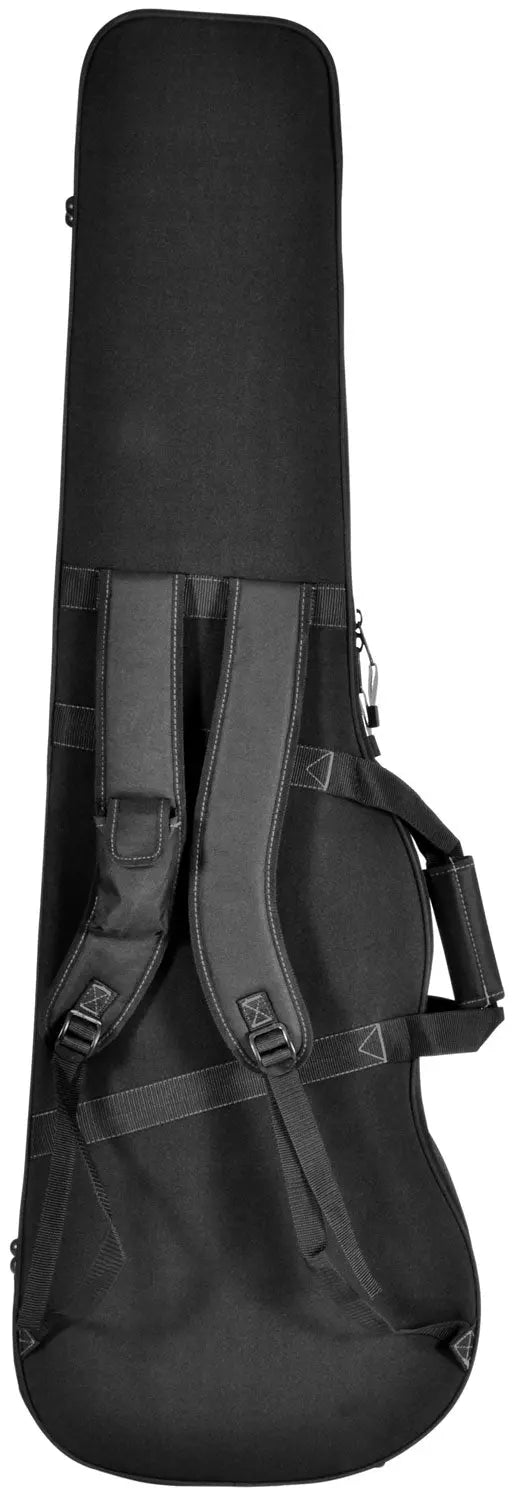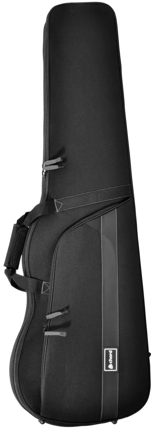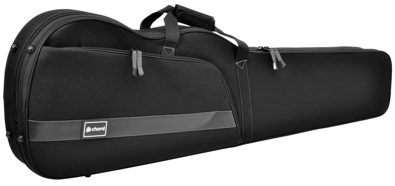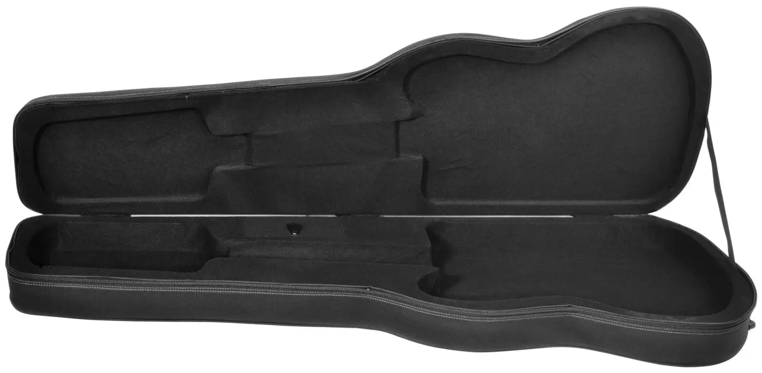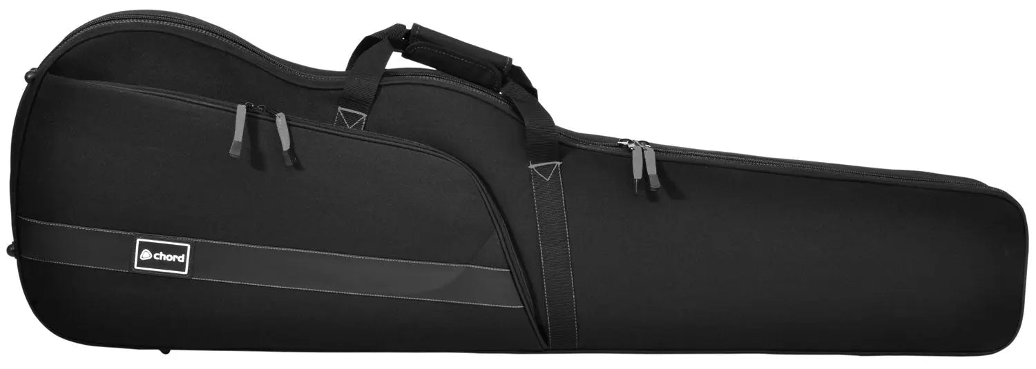 Ultra-lightweight transit cases for guitar with shaped interiors formed from solid expanded foam. Exterior is enclosed by durable fabric secured by a heavy duty zip and a large external pocket for literature and accessories.Outer is furnished with protective rubber feet, edge piping and double-stitched carrying handles. Interior has body and neck supports with accessory section and is coated with synthetic plush material.